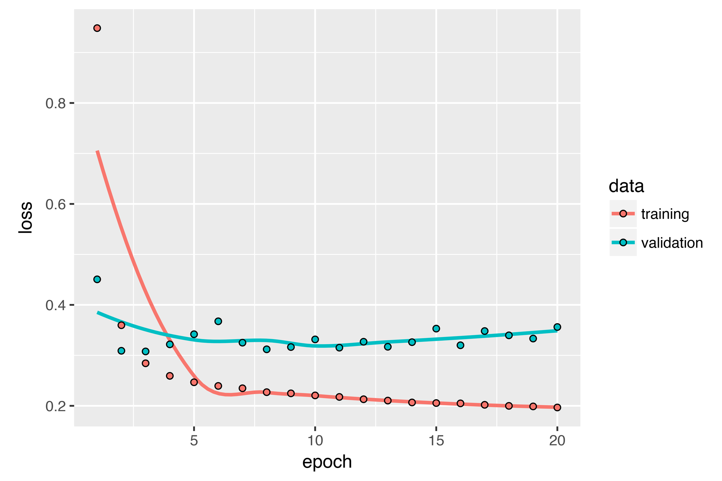 The plot below shows the results. Success! You’re no longer overfitting during the first 20 epochs. But although you have more stable evaluation scores, your best scores aren’t much lower than they were previously.