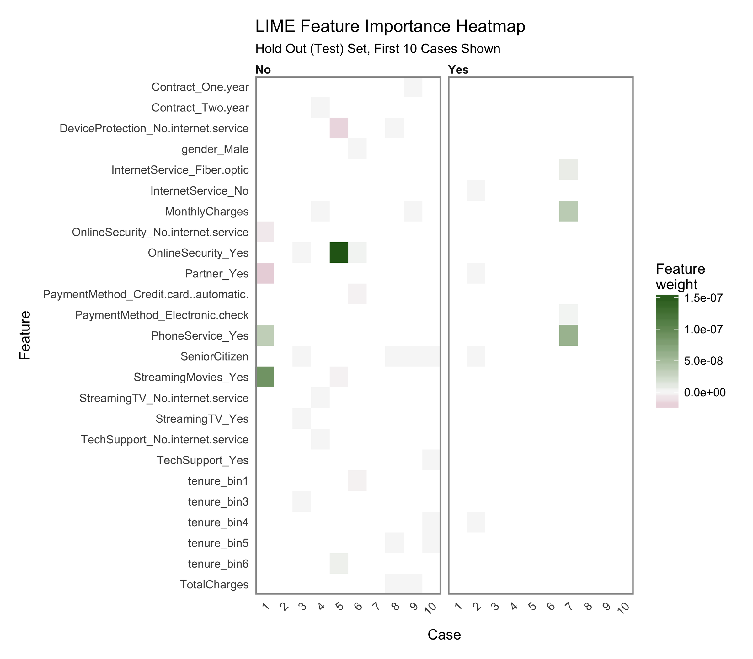 While LIME did not indicate this as a primary feature in the first 10 cases, the feature is clearly correlated with those electing to stay. Customers with fiber optic service are more likely to churn while those with no internet service are less likely to churn. Improvement Area: Customers may be dissatisfied with fiber optic service.