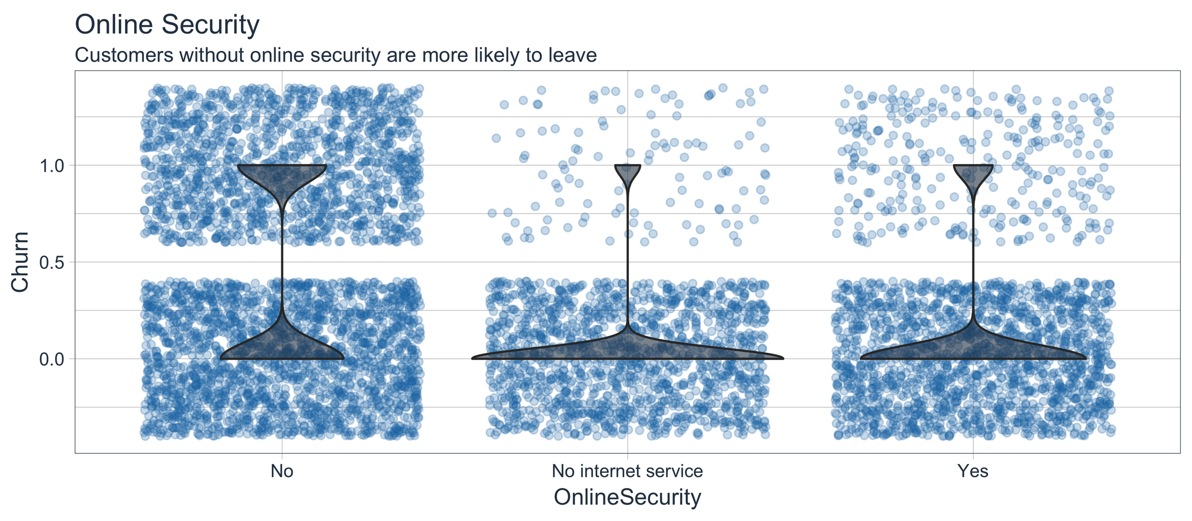 Customers that did not sign up for online security were more likely to leave while customers with no internet service or online security were less likely to leave. Opportunity: Promote online security and other packages that increase retention rates.