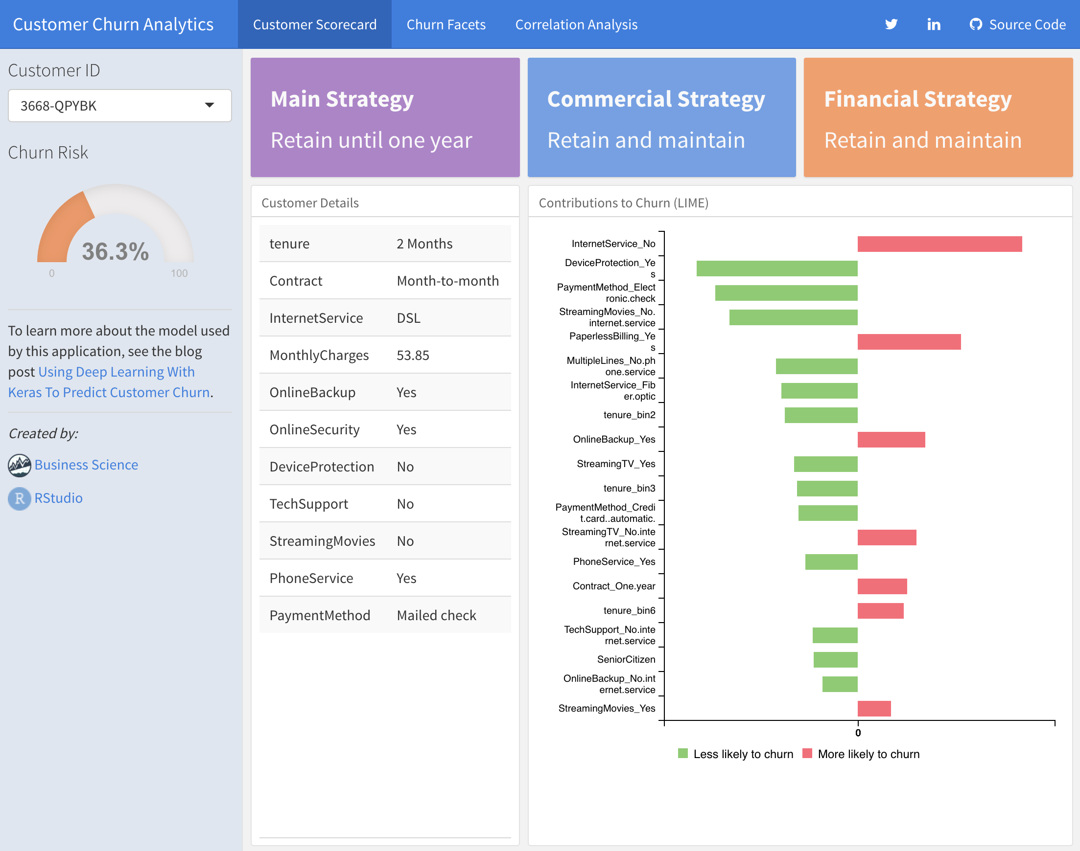 We even built a Shiny Application with a Customer Scorecard to monitor customer churn risk and to make recommendations on how to improve customer health! Feel free to take it for a spin.