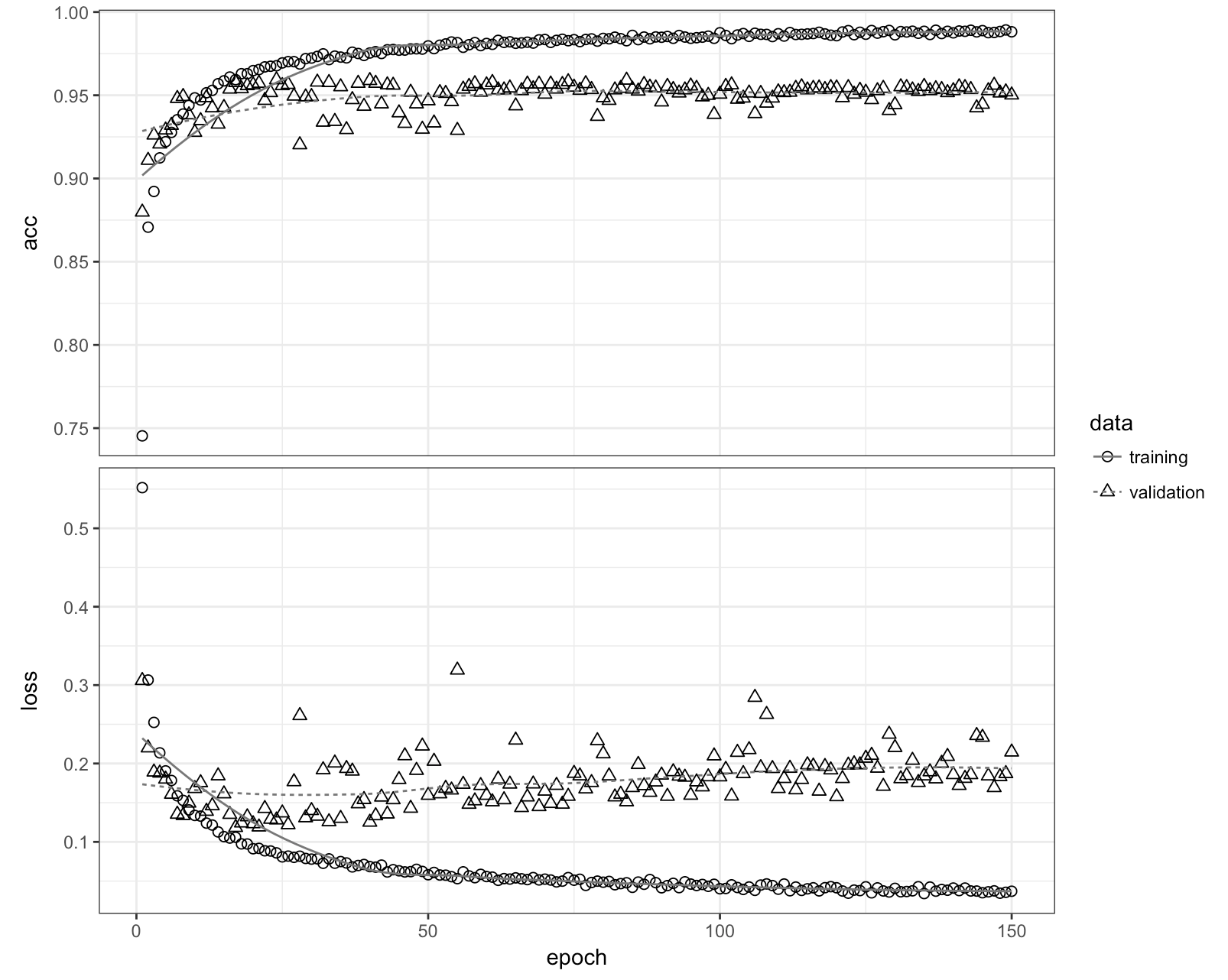 We use the fit() function to train the model for 150 epochs using batches of 50 peptide ‘images’: