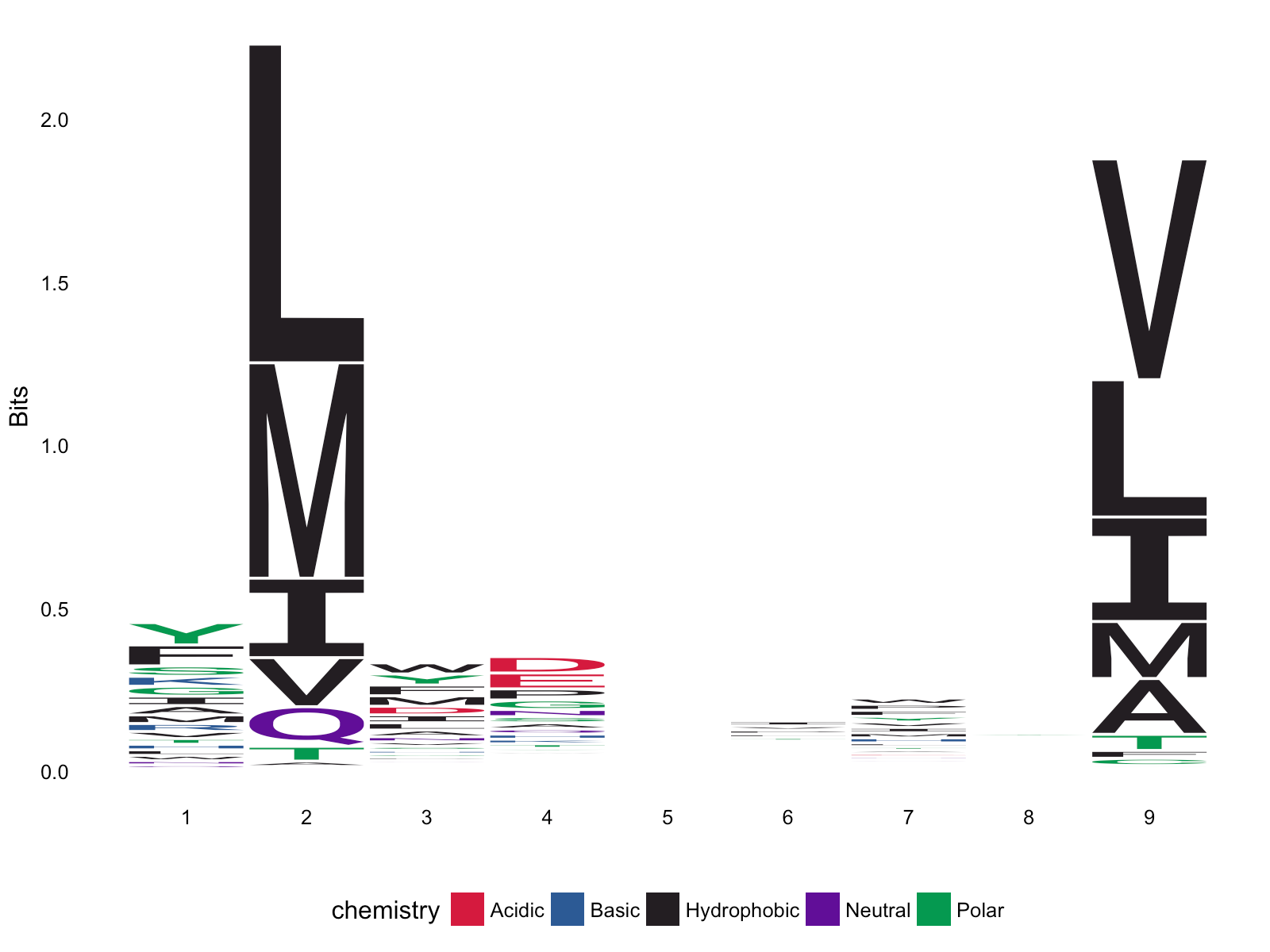 From the sequence logo, it is evident, that L,M,I,V are found often at p2 and p9 amongst the strong binders. In fact these position are referred to as the anchor positions, which interact with the MHCI. The T-cell on the other hand, will recognize p3-p8.