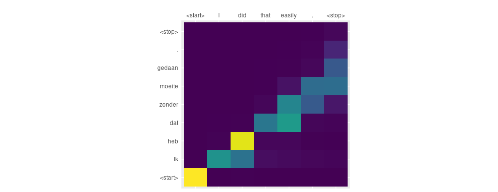 We see that overall, given a sample where respective sentences align very well, the decoder pretty much looks where it is supposed to. Let’s pick something a little more complicated.