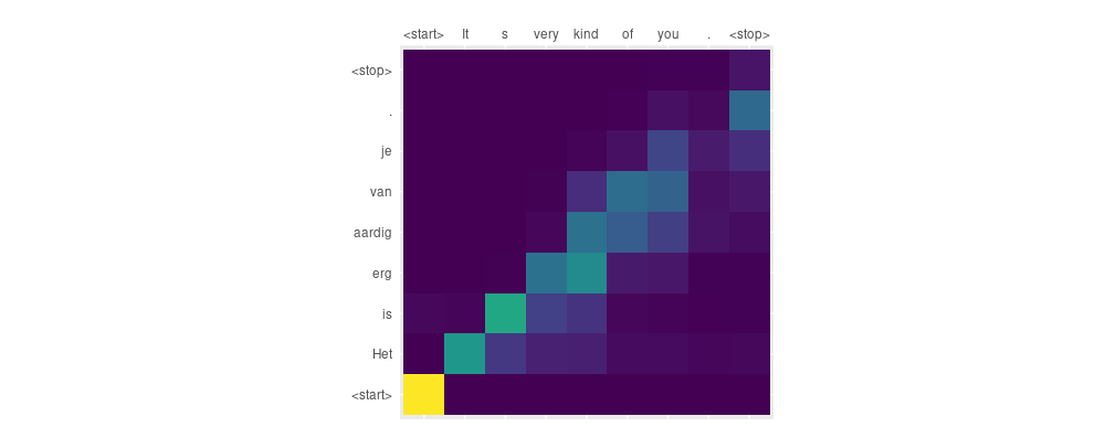 As you see it can be quite interesting watching the network’s “language capability” evolve. Now, how about subjecting our network to a little MRI scan? Since we’re collecting the attention weights, we can visualize what part of the source text the decoder is attending to at every timestep.
