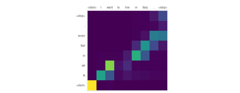These two sentences don’t align well. We see that Dutch in correctly picks English in (skipping over to live), then Itali attends to Italy. Finally leven is produced without us witnessing the decoder looking back to live. Here again, it would be interesting to watch what happens a few epochs later!
