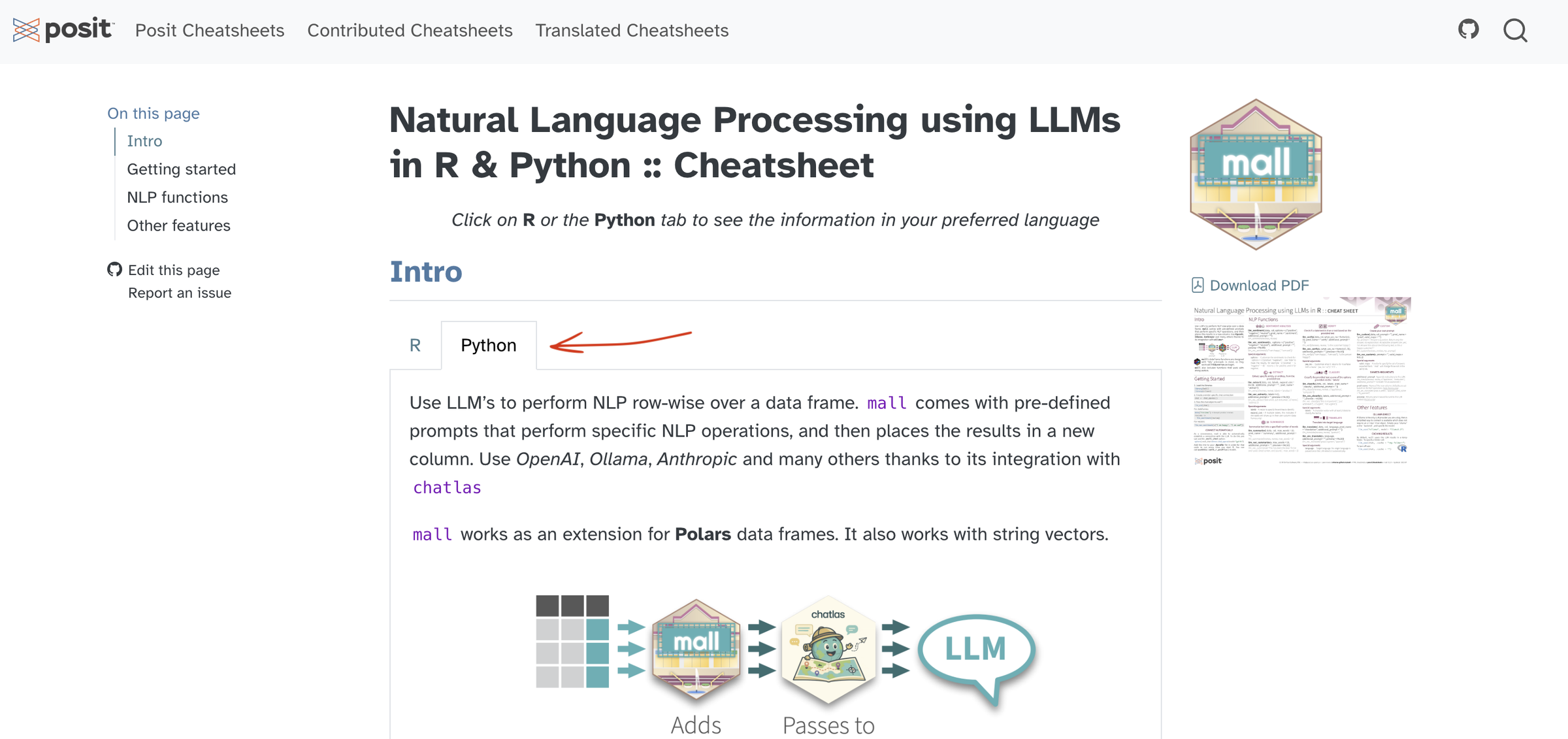 The brand new official cheatsheet is now available from Posit: Natural Language processing using LLMs in R/Python . Its mean feature is that one side of the page is dedicated to the R version, and the other side of the page to the Python version.