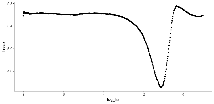 , it makes sense to spend some time upfront to determine an efficient learning rate. While out-of-the-box, torch does not provide a tool like fast.ai’s learning rate finder, the logic is straightforward to implement. Here’s how to find a good learning rate, as translated to R from Sylvain Gugger’s post
