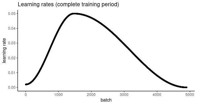 Here, we use lr_one_cycle(), passing in our newly found, optimally efficient, hopefully, value 0.05 as a maximum learning rate. lr_one_cycle() will start with a low rate, then gradually ramp up until it reaches the allowed maximum. After that, the learning rate will slowly, continuously decrease, until it falls slightly below its initial value.
