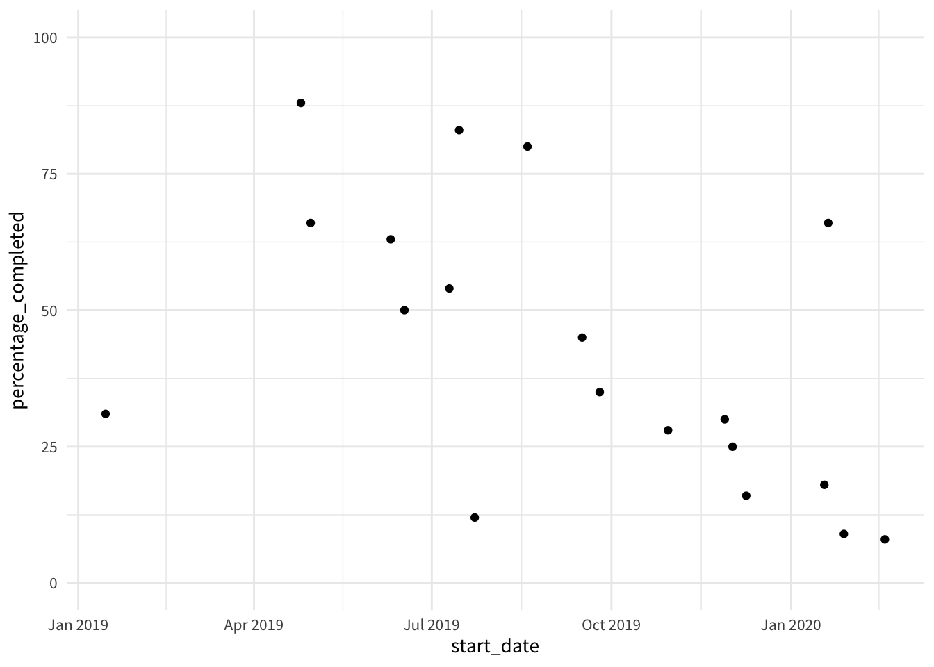 Setting aside the first class at rstudio::conf 2019 the overall completion rate seems to be hovering around 45%, and the average time a little over 100 days. We’d like to increase the first figure and lower the second one, but overall we’re pretty happy.