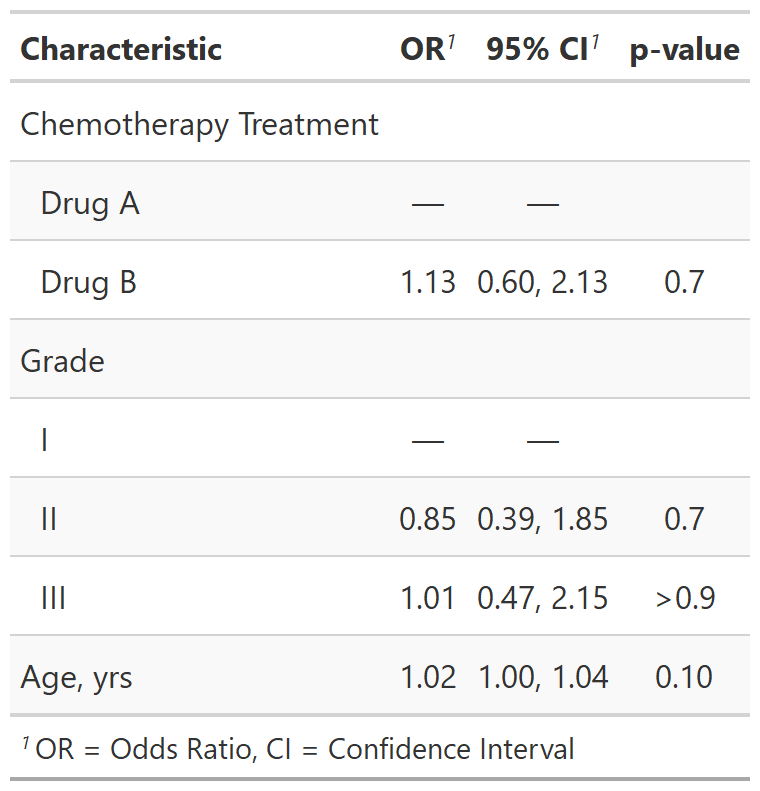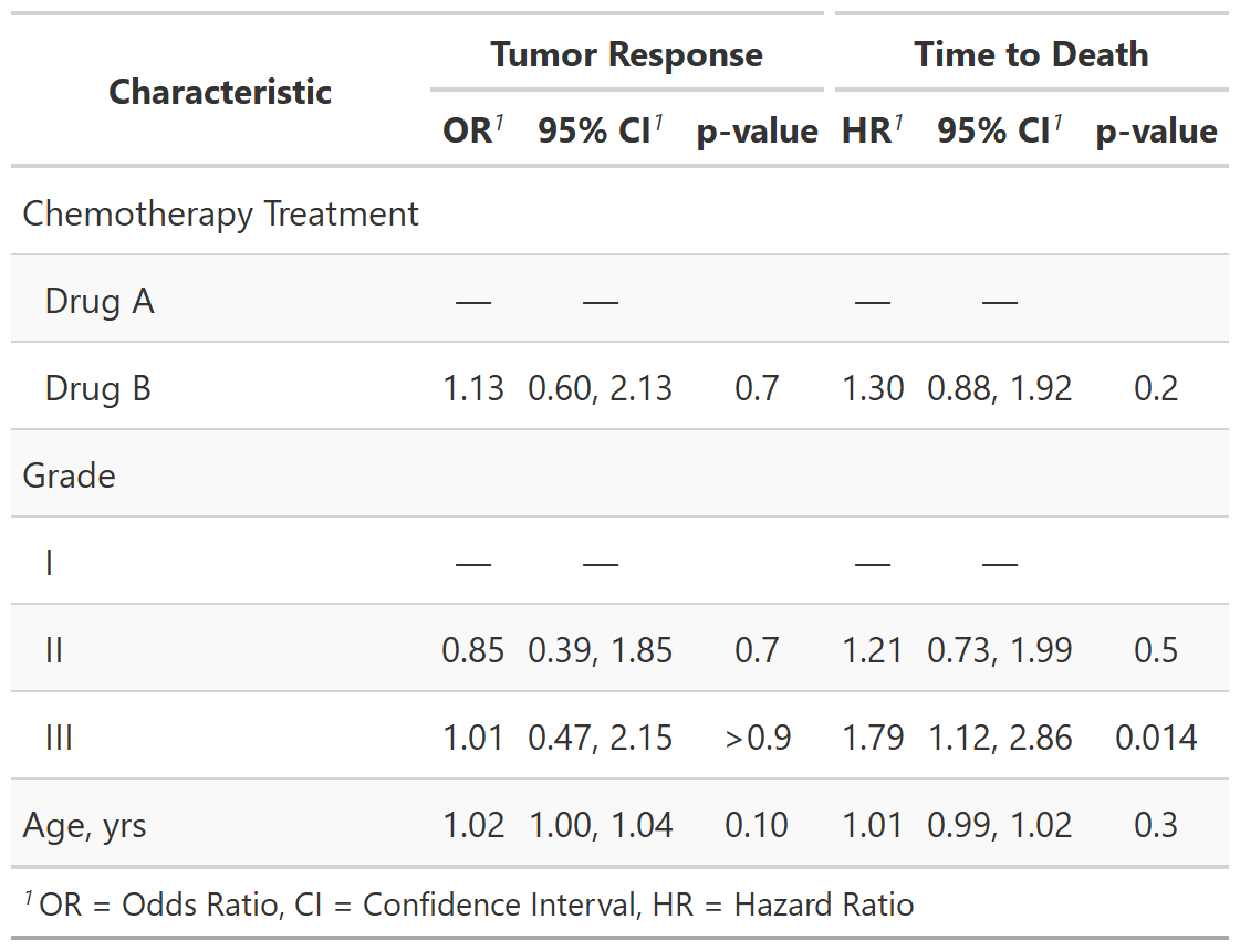 broom::tidy()in the background, gtsummary plays nicely with many model types (lm, glm, coxph, glmer etc.). You may also use custom functions to summarize regression models that do not currently have broom tidiers. - Customize gtsummary tables using a growing list of formatting/styling functions: everything from which statistics and tests to use to how many decimal places to round to, bolding labels, indenting categories and more!