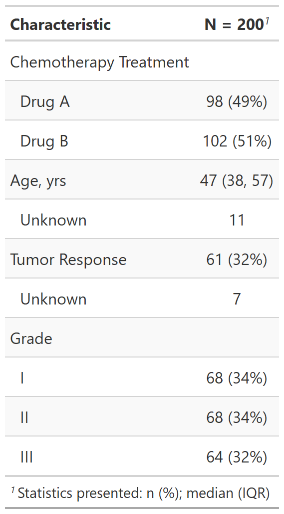 At the time we created the package, we had several ideas in mind for our ideal table summary package. We also wanted our tables to be able to take advantage of all the features in RStudio’s newly released gt package, which offers a variety of table customization options like spanning column headers, table footnotes, stubhead label, row group labels and more. So, gtsummary was born!