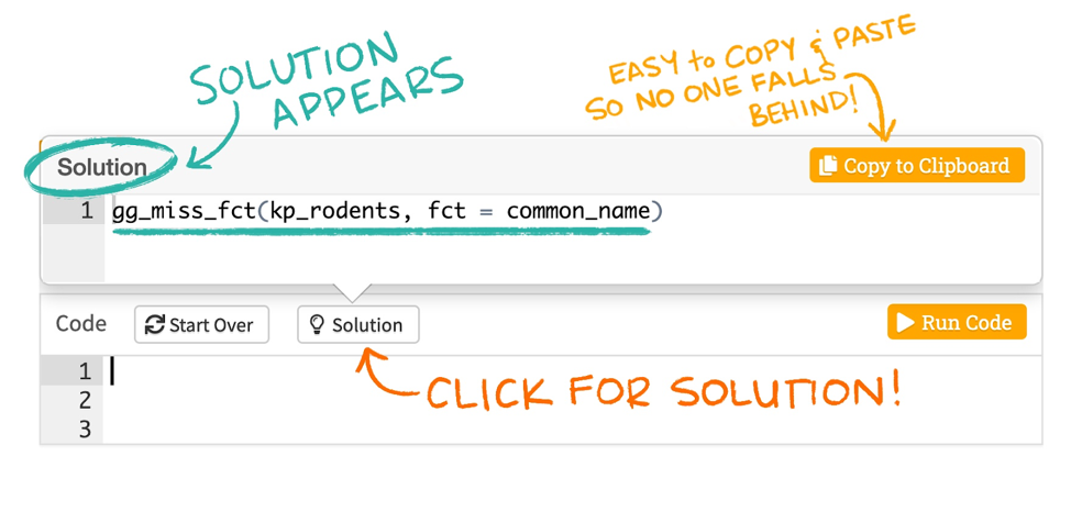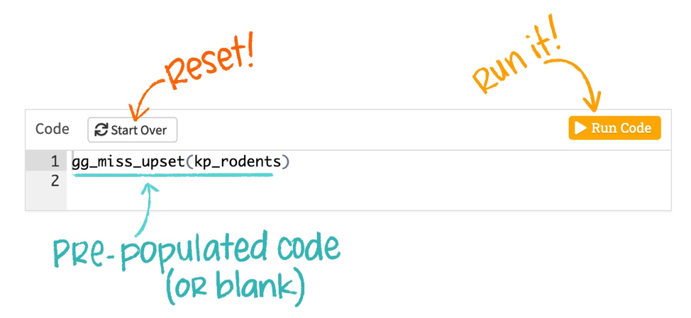 For example, you can pre-populate a code example for a basic graph with ggplot2, and users could just add or update variables for the x- and y- aesthetic. Even better: there is no risk of them breaking it. For each code example, there is a button in the top left to “Start Over,” which will return the code to the original.