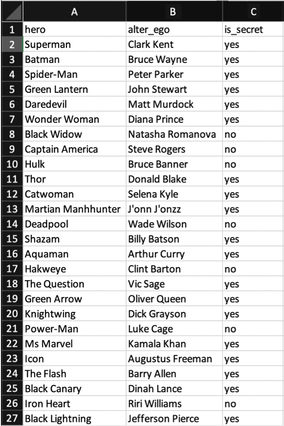 If you would like to follow along, you can download the Excel file called superheroes.xlsx here