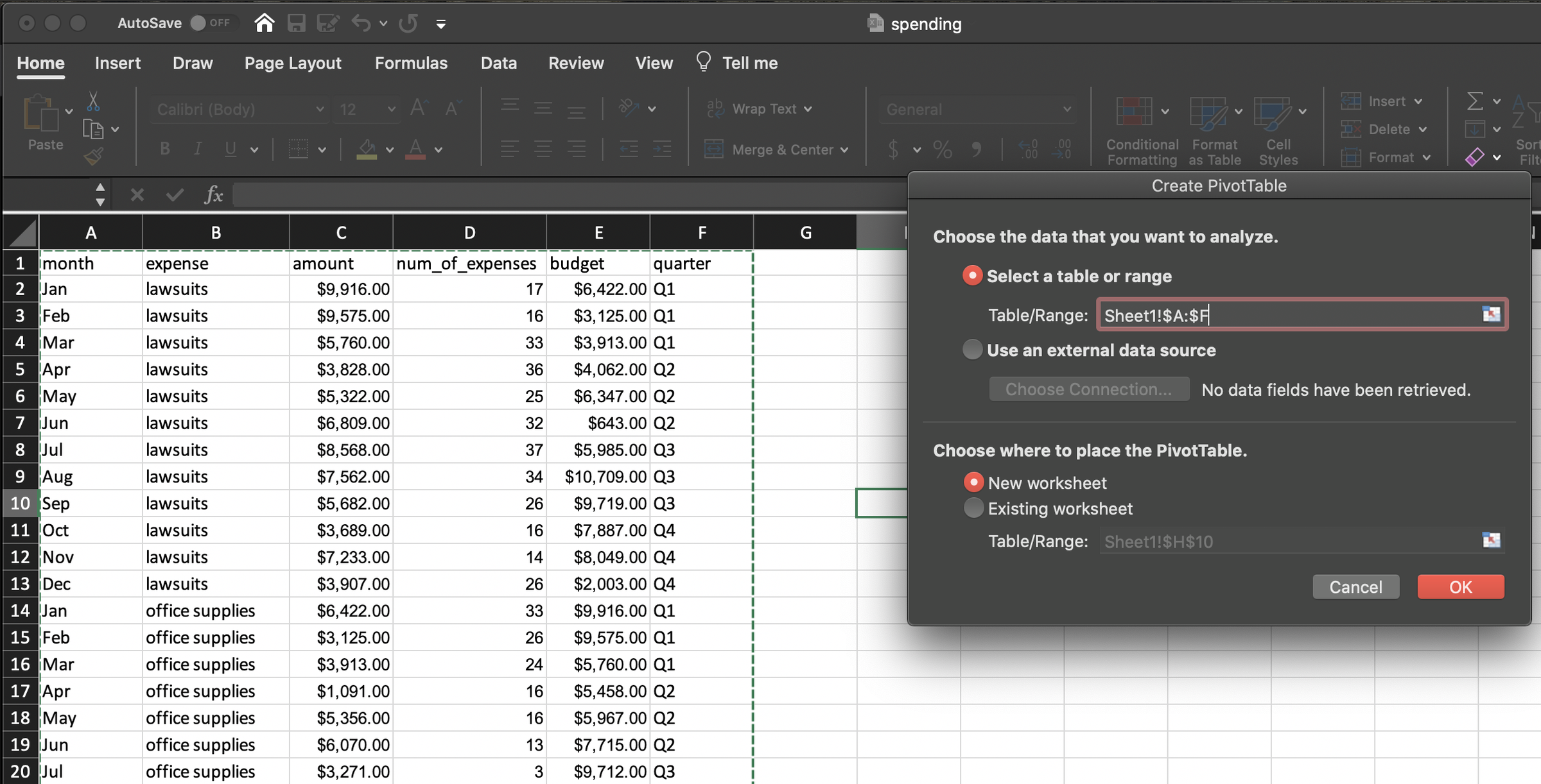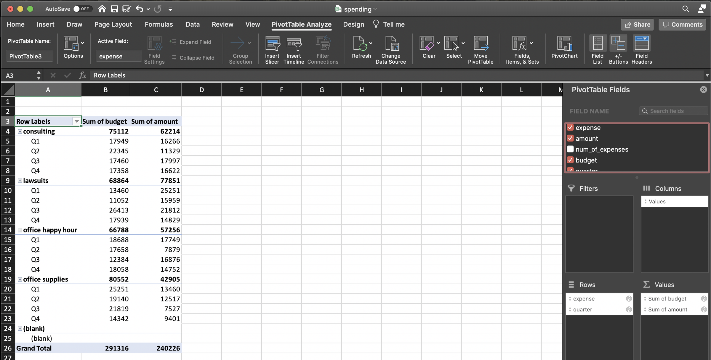 And then, it’s as simple as dragging and dropping our variables of interest into specific order with expense and quarter in rows and budget and amount in values, specifying a sum calculation.