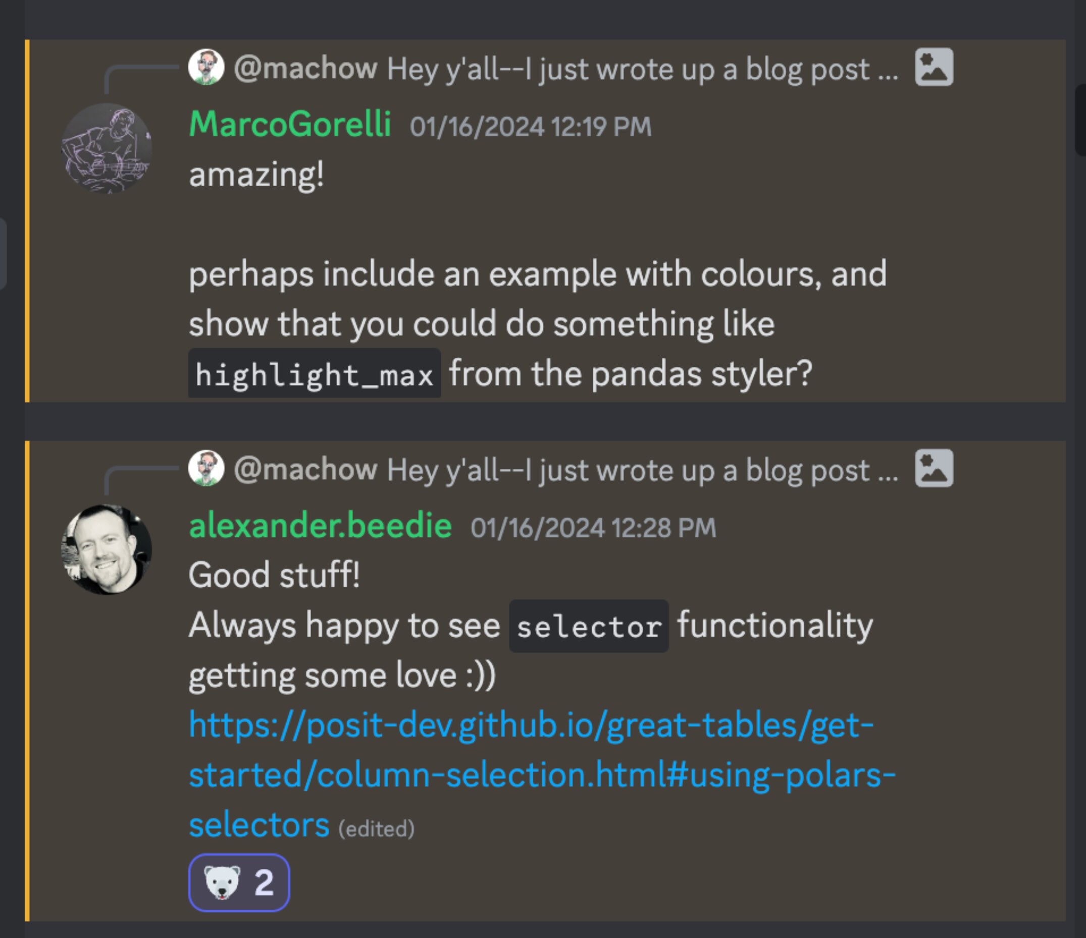This post looked at how interacting with the Polars community discord shaped Great Tables development early on, and how community members like Jerry ended up ensuring Great Tables and Polars played well together.