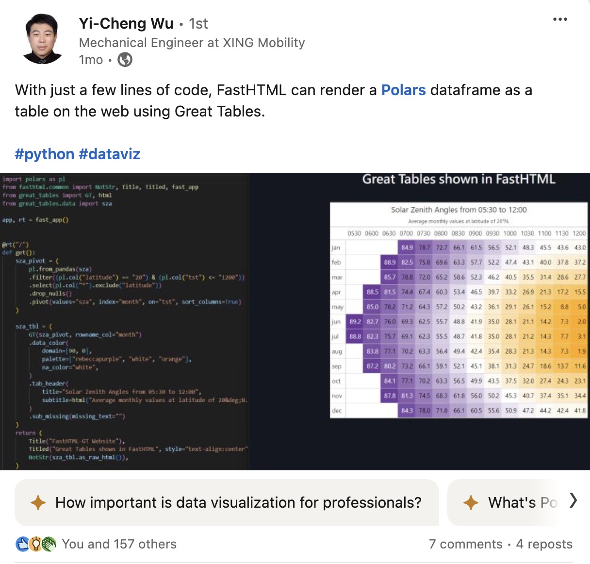 Rich and I had no idea that was possible, and the FastHTML folks ended up adapting his example into an entry on their gallery . Jerry is constantly teaching us about what Great Tables can do.