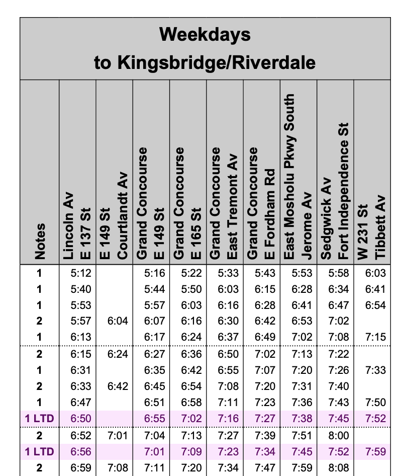 We set out to recreate this table in Great Tables (and by we I mean 99% Rich). In this post, I’ll walk quickly through how we recreated it, and share some other examples of transit timetables in the wild. For the theory behind why tables like this are useful, see The Design Philosophy of Great Tables .