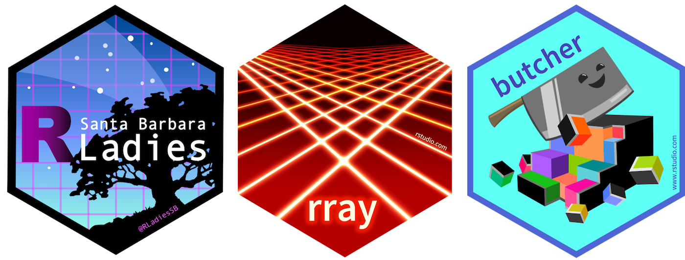 And, I’ve been working on hex designs for R-related groups and packages! Here are a few: the hex sticker for Santa Barbara R-Ladies (our growing local chapter of R-Ladies Global