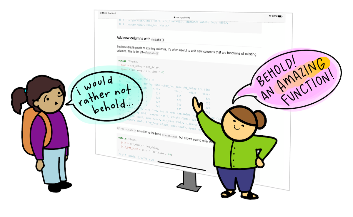 When teaching, I’ve frequently found myself struggling to motivate students to try new R packages or functions. As an example, imagine you’re a student in an “Intro to Data Science” class learning to code for the first time. You’re already kind of intimidated by R, and then the really excited (unnamed) instructor exclaims “dplyr::mutate() is sooooo awesome!!!” while displaying code examples and/or R documentation on a slide behind them: