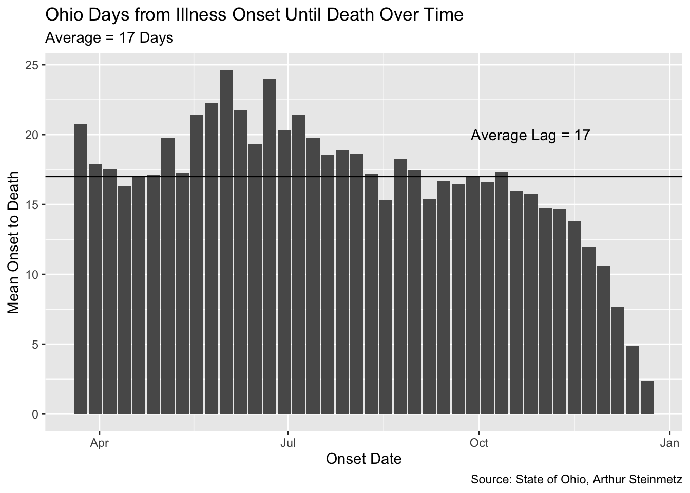 title = "Ohio Days from Illness Onset Until Death Over Time",