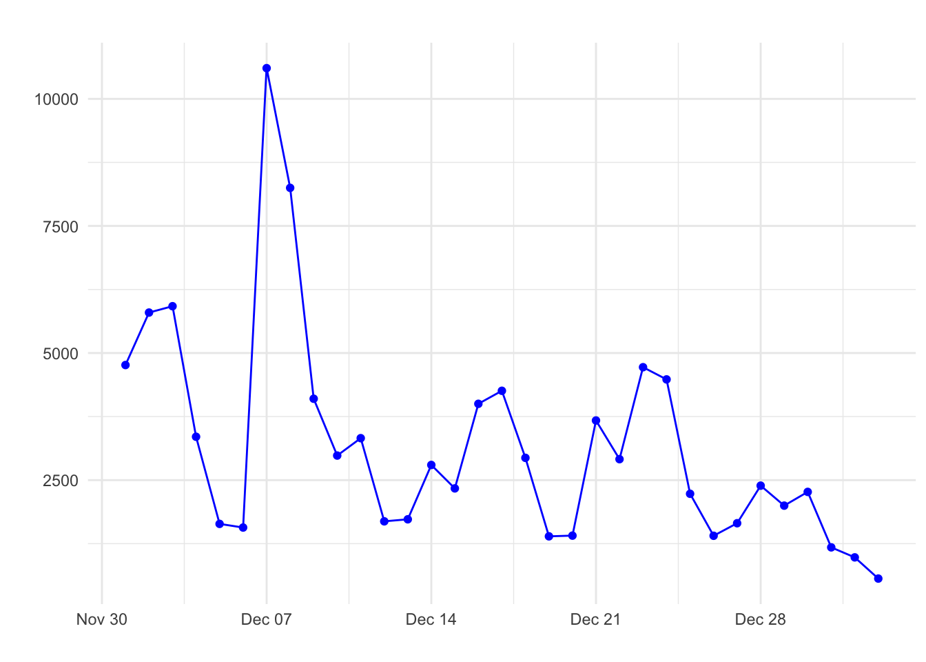 With the GA data in a tibble, we can use dplyr to group and sum the page views by day and then plot the data over time with ggplot2. This code will go in the R chunk under the heading Chart A.