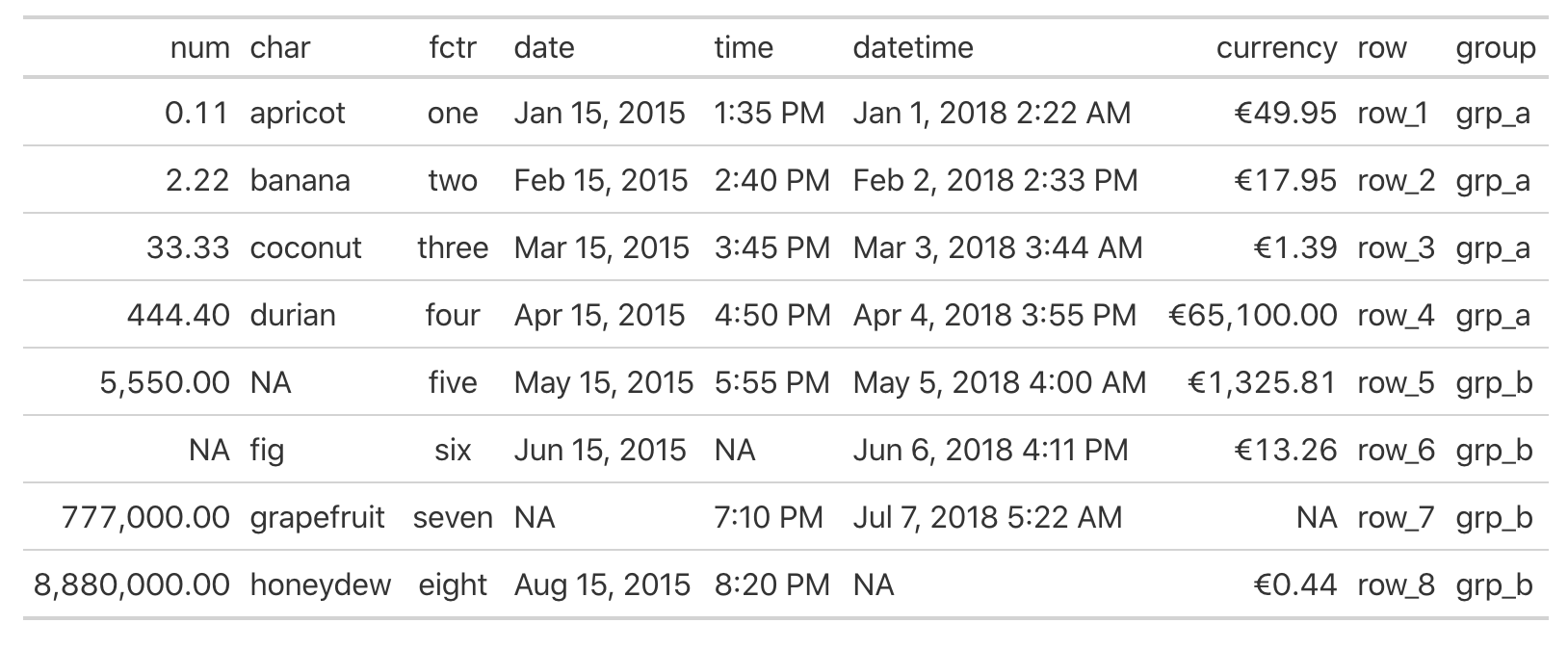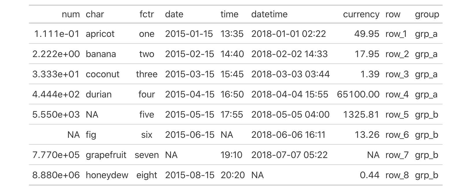 ## 8 8880000 honeydew eight 2015-08… 20:20 <NA> 0.44 row_8 grp_b
