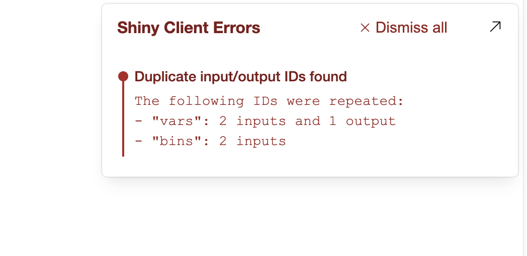Shiny for Python 0.9.0 includes an error console that surfaces client-side errors directly in the browser’s UI when running applications locally. The error console also catches common issues, such as duplicated input or output IDs, that can only be caught when the app is running.
