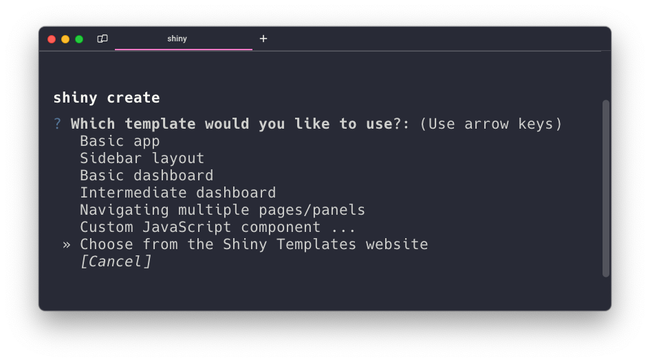The shiny create CLI command now includes additional templates and an option to open the new Shiny Templates website