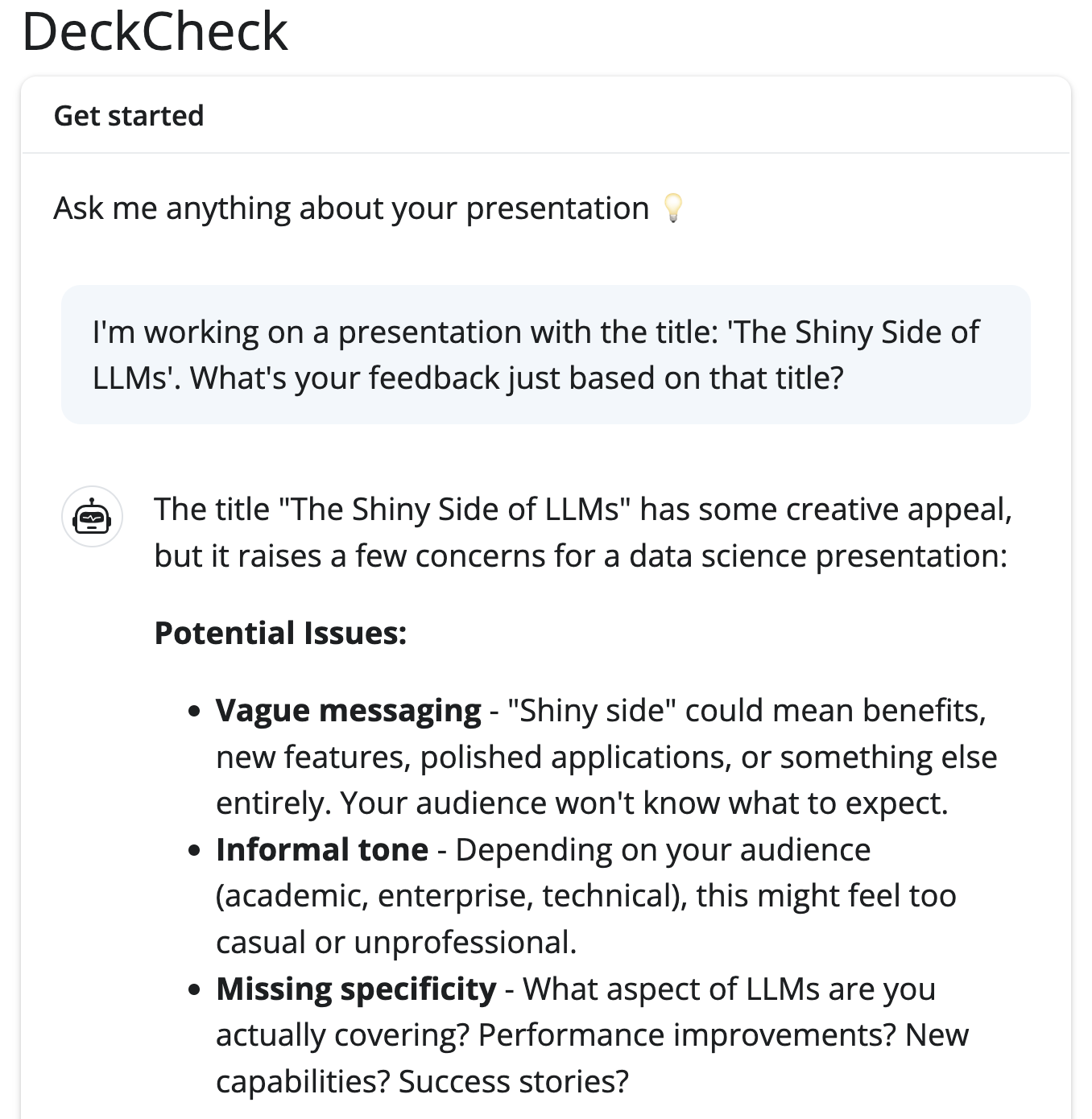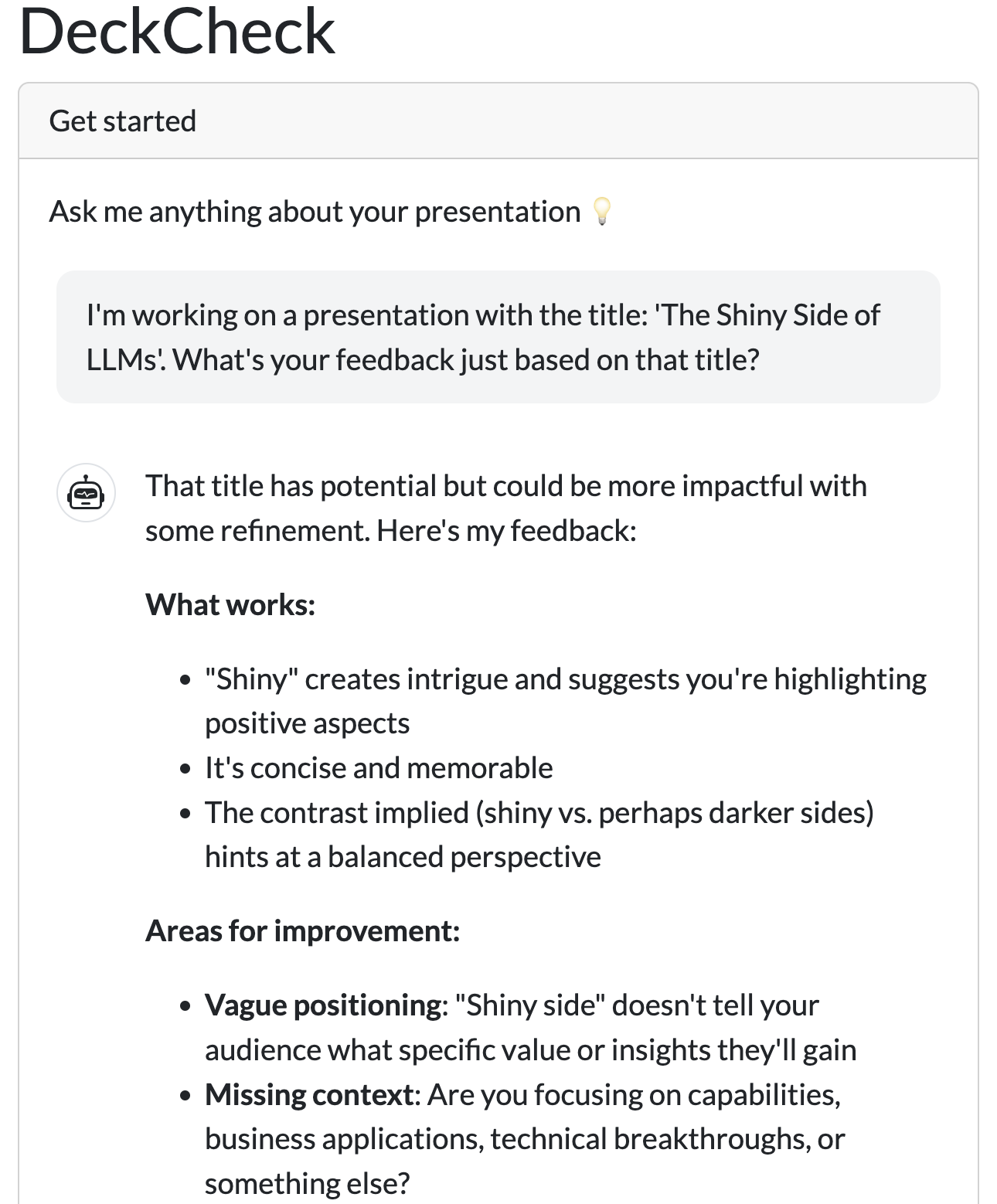 You give constructive, focused, and practical feedback on titles, structure, and storytelling.")chat$chat_async("I'm working on a presentation with the title: 'The Shiny Side of LLMs'.