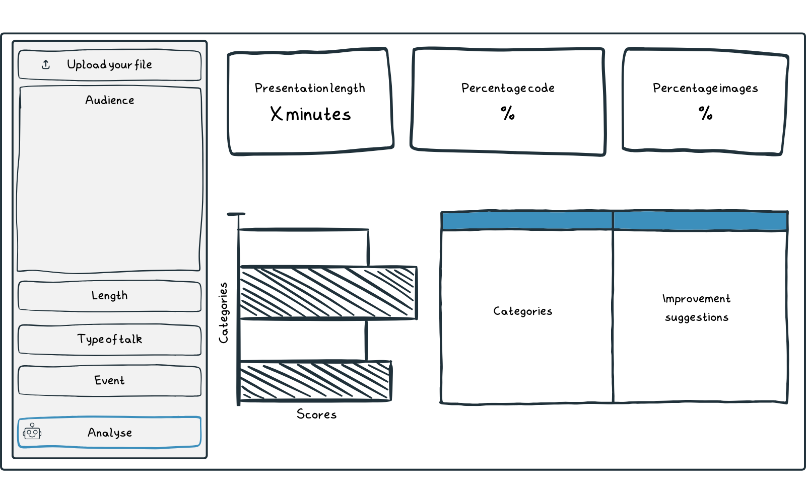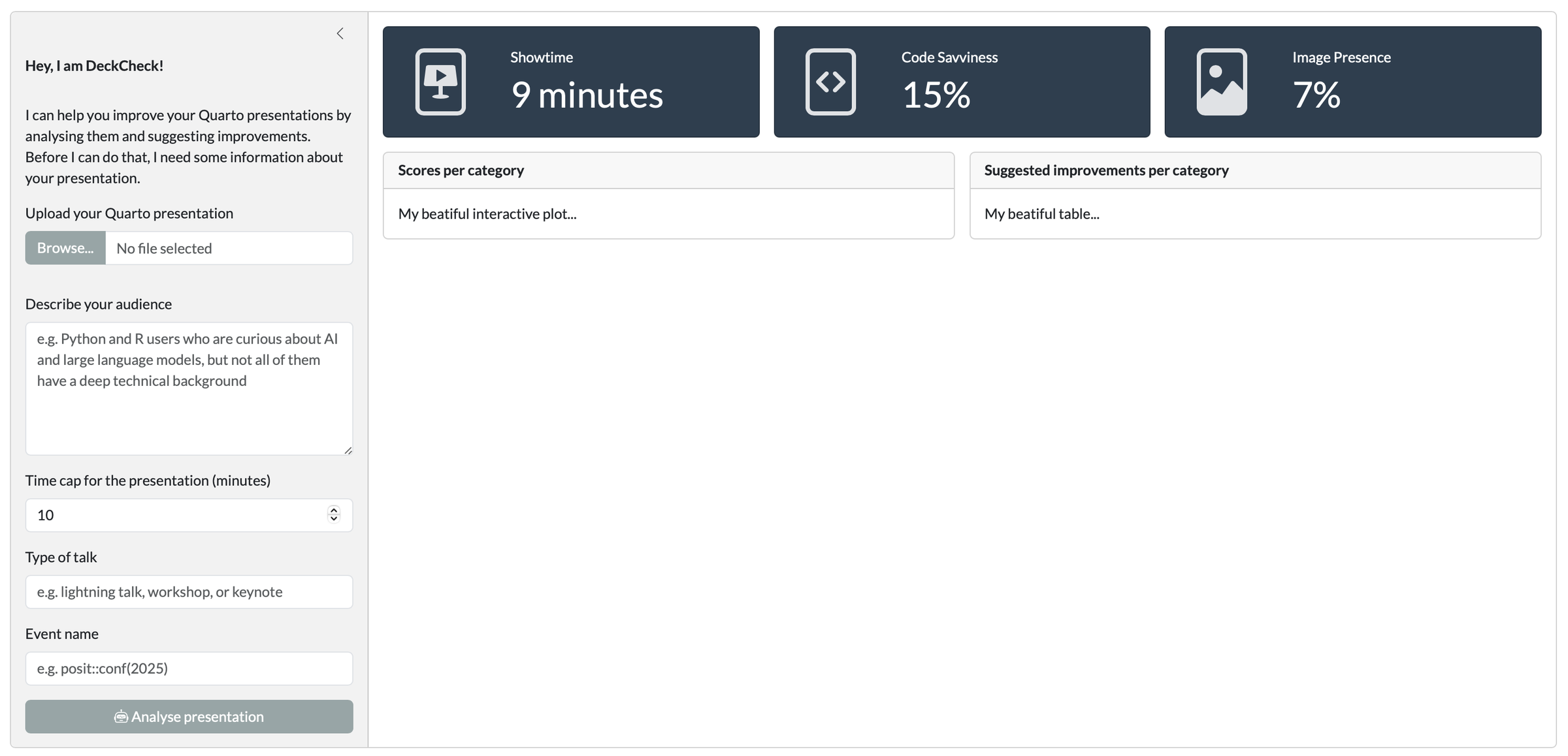 ")),## Layoutlayout_sidebar(## Sidebar contentsidebar=sidebar(width=400,# Open sidebar on mobile devices and show above contentopen=list(mobile="always-above"),strong(p("Hey, I am DeckCheck!")),p("I can help you improve your Quarto presentations by analysing them and suggesting improvements.