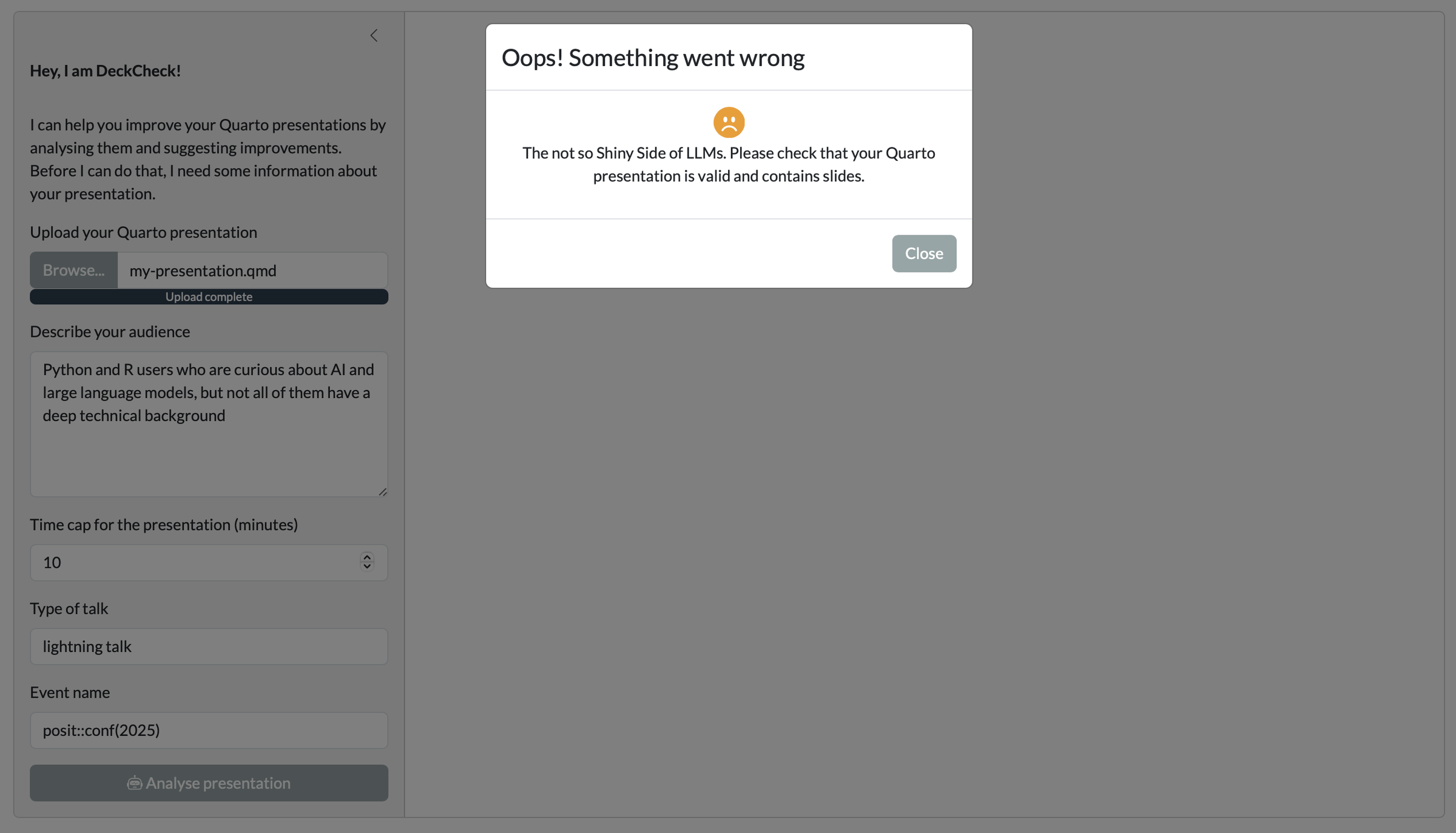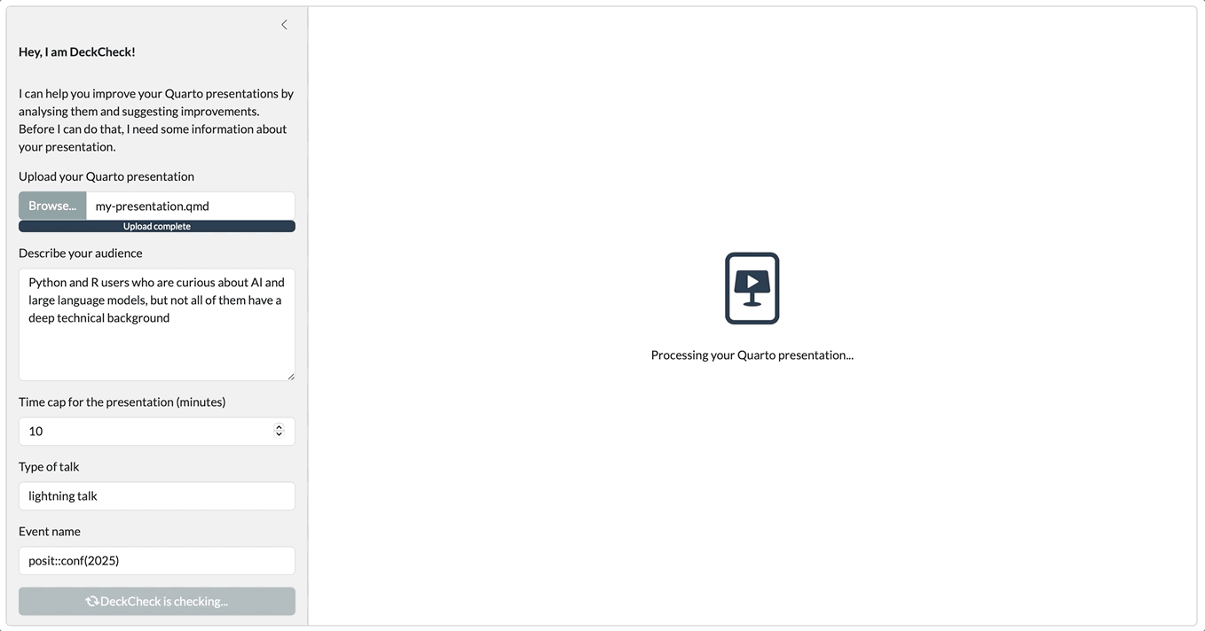This part of “The Shiny Side of LLMs” series will build an app called “DeckCheck”: a genius app that gets rid of lengthy unfocused presentations, like a perfect “Presentation Rehearsal Buddy”. The goal: let users upload their Quarto