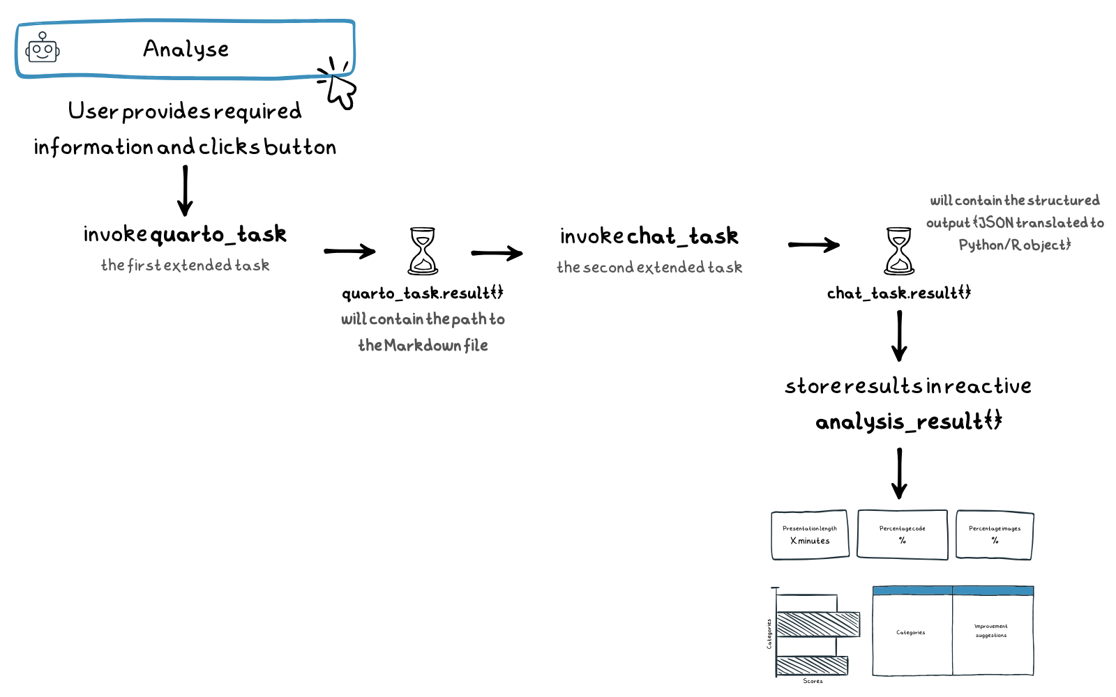 Before I can do that, I need some information about your presentation."),fileInput(inputId="file",label="Upload your Quarto presentation",accept=c(".qmd",".qmdx")),textAreaInput(inputId="audience",height="150px",label="Describe your audience",placeholder="e.g. Python and R users who are curious about AI and large language models, but not all of them have a deep technical background"),numericInput(inputId="length",label="Time cap for the presentation (minutes)",value=10),textInput(inputId="type",label="Type of talk",placeholder="e.g. lightning talk, workshop, or keynote"),textInput(inputId="event",label="Event name",placeholder="e.g. posit::conf(2025)"),input_task_button(id="submit",label=shiny::tagList(bsicons::bs_icon("robot"),"Analyse presentation"),label_busy="DeckCheck is checking...",type="default")),## Main contentuiOutput("results",height="100%")))server<-function(input,output,session){quarto_task<-ExtendedTask$new(function(file_path,temp_dir){# We're using an Extended Task to avoid blocking. Note that# a temporary directory called within mirai will be# different from the one in the "main" Shiny session. Hence,# we pass a temp_dir parameter to the task and use that.mirai({qmd_file<-file.path(temp_dir,"my-presentation.qmd")file.copy(file_path,qmd_file,overwrite=TRUE)quarto::quarto_render(input=qmd_file,output_format=c("markdown","html"))# Return the path to the markdown filefile.path(temp_dir,"my-presentation.md")},# Use the same environment as the Shiny appenvironment())})|>bind_task_button("submit")chat_task<-ExtendedTask$new(function(system_prompt,markdown_content,type_deck_analysis){# We're using an Extended Task to avoid blocking the session and# we start a fresh chat session each time.# For a feedback loop, we would use a persistent chat session.chat<-chat_anthropic(model="claude-sonnet-4-20250514",system_prompt=system_prompt,params=params(temperature=0.8# default is 1))# Register the tool with the chatchat$register_tool(calculate_slide_metric)# Start conversation with the chat# Task 1: regular chat to extract meta-datachat_res<-chat$chat_async(interpolate("Execute Task 1 (counts). Here are the slides in Markdown: {{ markdown_content }}"))chat_res$then(function(res){# Print the response from Task 1cat("Response from Task 1:\n")cat(res,"\n\n")# Execute next task# Task 2: structured chat to further analyse the slideschat$chat_structured_async("Execute Task 2 (suggestions)",type=type_deck_analysis)})})|>bind_task_button("submit")observe({req(input$file)req(input$audience)req(input$length)req(input$type)req(input$event)tryCatch({# Error for testing# stop("This is a test error.")# Get file path of the uploaded filefile_path<-input$file$datapathquarto_task$invoke(file_path,temp_dir=tempdir())},error=function(e){rlang::warn(paste("Error when trying to invoke quarto_task:",e$message))# Print stack traceprint(rlang::trace_back())# Show modal to the usershowModal(modalDialog(title="Oops! Something went wrong",div(class="text-center",bsicons::bs_icon("emoji-frown-fill",size="2em",class="text-warning"),br(),p("The not so Shiny Side of LLMs. Please check that your Quarto presentation is valid and contains slides.")),easyClose=TRUE,footer=modalButton("Close")))})})|>bindEvent(input$submit)observe({req(quarto_task$result())tryCatch({# Error for testing# stop("This is a test error.")# Get the Markdown file path from the completed quarto_taskmarkdown_file<-quarto_task$result()# Read the generated Markdown file containing the slidesmarkdown_content<-readChar(markdown_file,file.size(markdown_file))# Define prompt filesystem_prompt_file<-here::here("prompts","prompt-analyse-slides-structured-tool.md")# Create system promptsystem_prompt<-interpolate_file(path=system_prompt_file,audience=input$audience,length=input$length,type=input$type,event=input$event)# Trigger the chat task with the provided inputschat_task$invoke(system_prompt=system_prompt,markdown_content=markdown_content,type_deck_analysis=type_deck_analysis)},error=function(e){rlang::warn(paste("Error when trying to invoke chat_task:",e$message))# Print stack traceprint(rlang::trace_back())# Show modal to the usershowModal(modalDialog(title="Oops! Something went wrong",div(class="text-center",bsicons::bs_icon("emoji-frown-fill",size="2em",class="text-warning"),br(),p("The not so Shiny Side of LLMs. Unfortunately, chatting didn't work out. Do you have enough credits left?")),easyClose=TRUE,footer=modalButton("Close")))})})# Reactive expression to hold the analysis resultanalysis_result<-reactive({named_list<-chat_task$result()make_frames(named_list)})output$results<-renderUI({if(quarto_task$status()=="running"){div(class="text-center d-flex flex-column justify-content-center align-items-center",style="height: 100%;",bsicons::bs_icon("file-slides",size="6em",class="text-primary bounce"),br(),p("Processing your Quarto presentation..."))}elseif(chat_task$status()=="running"){div(class="text-center d-flex flex-column justify-content-center align-items-center",style="height: 100%;",bsicons::bs_icon("robot",size="6em",class="text-primary bounce"),br(),p("The LLM is doing its magic..."))}elseif(chat_task$status()=="success"){tagList(layout_column_wrap(fill=FALSE,### Value boxes for metricsvalue_box(title=tooltip(span("Showtime ",bsicons::bs_icon("question-circle-fill")),"Slides are being counted based on the provided Quarto presentation, then an educated guess is made about the time it will take to present them."),value=textOutput("showtime"),showcase=bsicons::bs_icon("file-slides"),theme="primary"),value_box(title=tooltip(span("Code Savviness ",bsicons::bs_icon("question-circle-fill")),"Code Saviness is calculated based on the slides that contain code chunks. The percentage is the ratio of those slides to total slides."),value=textOutput("code_savviness"),showcase=bsicons::bs_icon("file-code"),theme="primary"),value_box(title=tooltip(span("Image Presence ",bsicons::bs_icon("question-circle-fill")),"Image Presence is calculated based on the slid