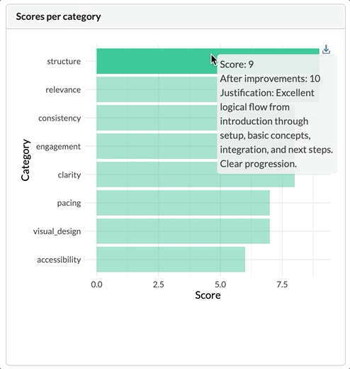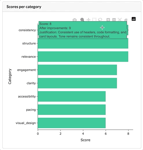 """meta_keys=["presentation_title","total_slides","percent_with_code","percent_with_images","estimated_duration_minutes","tone",]meta={k:d[k]forkinmeta_keys}# eval categories (everything else)evals=[]fork,vind.items():ifknotinmeta_keys:# fix typoevals.append({"category":k,"score":v["score"],"justification":v["justification"],"improvements":v["improvements"],"score_after_improvements":v["score_after_improvements"],})evals_df=pd.DataFrame(evals)return{"meta":meta,"evals":evals_df}# ======================# Tooltip helper# ======================defadd_line_breaks(text,width=50):ifnotisinstance(text,str):returntextwords=text.split()lines=[]current_line=""forwordinwords:# +1 accounts for the space if current_line isn't emptyiflen(current_line)+len(word)+(1ifcurrent_lineelse0)<=width:current_line+=(" "ifcurrent_lineelse"")+wordelse:lines.append(current_line)current_line=wordifcurrent_line:lines.append(current_line)return"<br>".join(lines)# ======================# Icons# ======================# SVG icon copied from https://icons.getbootstrap.com/icons/file-slides-fill/file_slides="""<svg xmlns="http://www.w3.org/2000/svg" fill="currentColor" class="bi bi-file-slides-fill" viewBox="0 0 16 16">