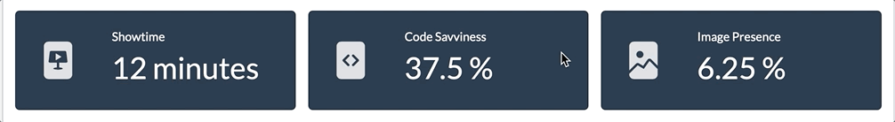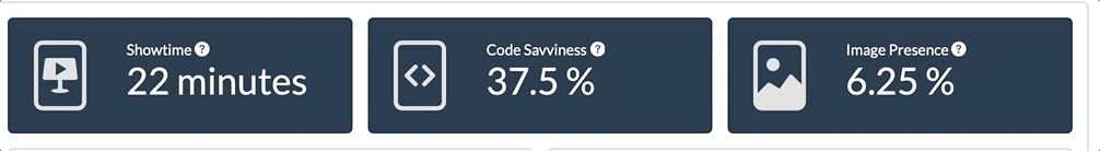 "code" for percentage of slides containing fenced code blocks,