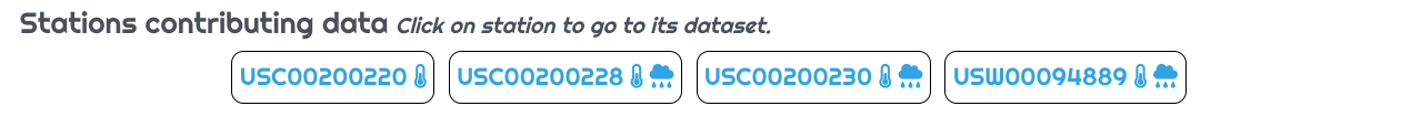 To let the user see exactly what weather stations went into generating their city’s averaged weather, a small panel is provided beneath the plot that lays out the long-and-complicated station id along with the types of data contributed by that station.