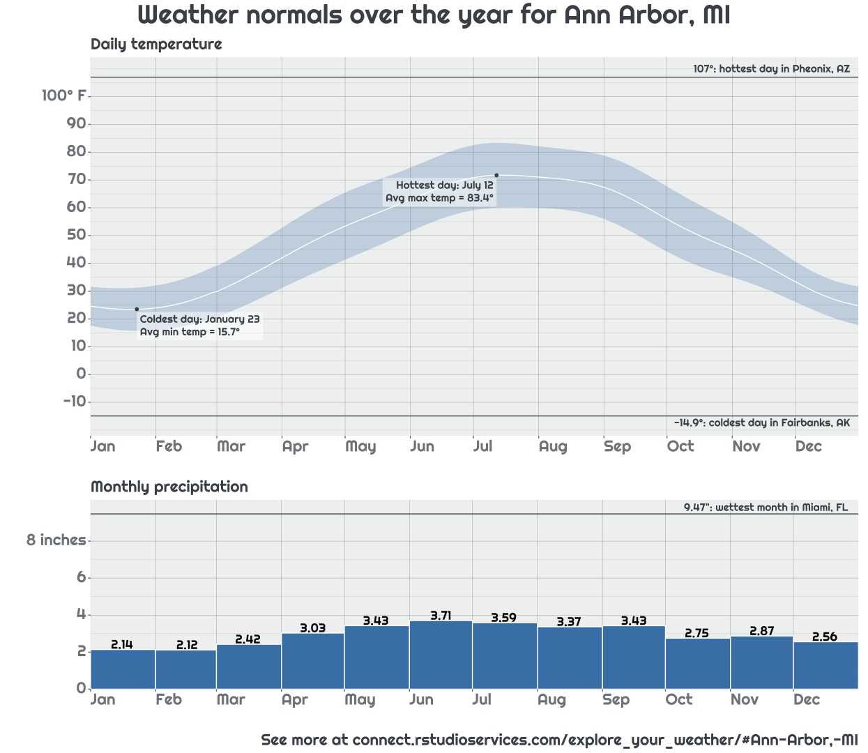While the inspiration is obvious, our app isn’t a direct copy. Our focus is more on getting a general idea of typical weather rather than comparing to a given year. Also, unlike the NYTimes article that uses javascript, our app is written completely in R (with a tiny bit of CSS).