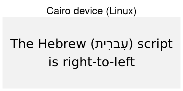If you’re not familiar with the languages above it can be hard to see what is right and what is wrong. You may, however, look at how the text in the code is rendered in the browser and compare that to the device rendering. If you do that, you can see that the Hebrew script is rendered in the wrong direction for all the non-ragg devices (except Cairo on Linux). For the Arabic and Sindhi it’s even harder to see what’s wrong because the text looks fundamentally different. That’s because both Arabic and Sindhi rely extensively on text substitution rules and ligatures; the way a letter is written depends critically on what letters it is next to. Still, by comparing to the browser rendering you can see that the same devices failing on the Hebrew script fail here as well.