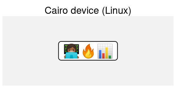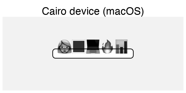 As one can see, the failures range from not being able to render anything, to rendering in monochrome. Further, it appears as if the devices have trouble figuring out the dimensions of the glyphs. One additional wrinkle is that while Cairo on macOS is capable of rendering in monochrome, it fails to get the correct emoji. This is because emojis rely heavily on ligatures, and the “dark-skinned woman at a computer” emoji is actually a ligature of the “woman”, “dark skin”, and “computer” emojis.