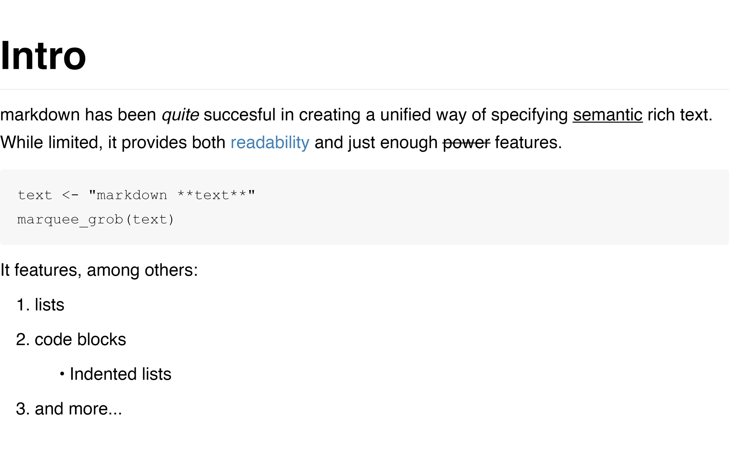 The above illustrates a couple of things. First and foremost, that markdown works in very unsurprising ways and you get what you type. In fact, the full CommonMark syntax is supported along with extensions for underline and strikethrough. Further, it shows that marquee provides its own extension for specifying custom span elements in the form of the {.class <text>} syntax. The renderer is clever in interpreting the class so that if it corresponds to a colour name, the colour is automatically applied to the text. Lastly, it shows that the default styling of markdown closely follows the look you’ve come to expect from markdown rendered to HTML.