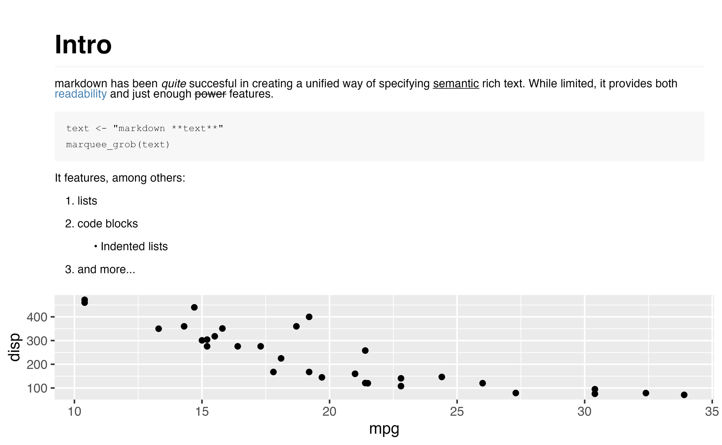 Lastly, while not really part of HTML syntax directly, many people rely on HTML inside markdown documents to solve layout and styling tasks that markdown doesn’t support. The way it works is that markdown passes the HTML through unmodified and then the HTML is parsed by the HTML renderer (often the browser) used to display the rendered markdown document. This makes it seem like understanding HTML is part of markdown, while it’s really not. The reason I’m going through all this explanation is to say that marquee has no understanding of HTML and will not render it as expected. While some HTML tags and CSS settings have clear counterparts in markdown and the marquee styling system it is much better to have a clear “no-support” over an arbitrary limited support. marquee_grob()