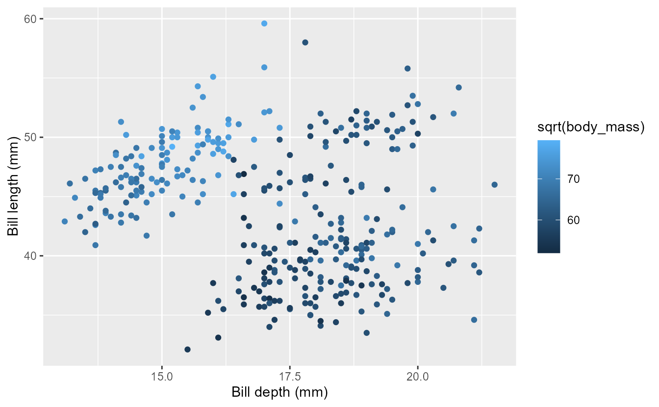 aes()is strictly used to map data instead of setting a fixed property. We diverge from this API for pragmatic reasons, not theoretical ones. ↩︎ -