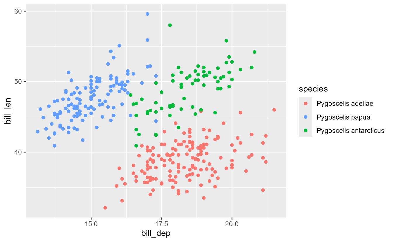 p <- ggplot(penguins, aes(bill_dep, bill_len, colour = species)) +