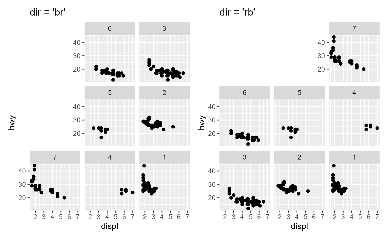 to do, for example, a reversed log10 transformation to highlight the smallest p-values. However, the transformation approach has a few limitations, notably that discrete scales do not support transformations and not all coords obeyed transformed scales. You can’t really combine coord_sf() + scale_x_log10() for example. To remedy this limitation, coords now have a reverse argument that can typically be "none", "x", "y" or "xy" that reverse some directions. If you are from the lands down under, you can now plot a map in your native orientation.