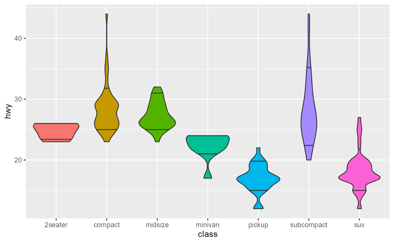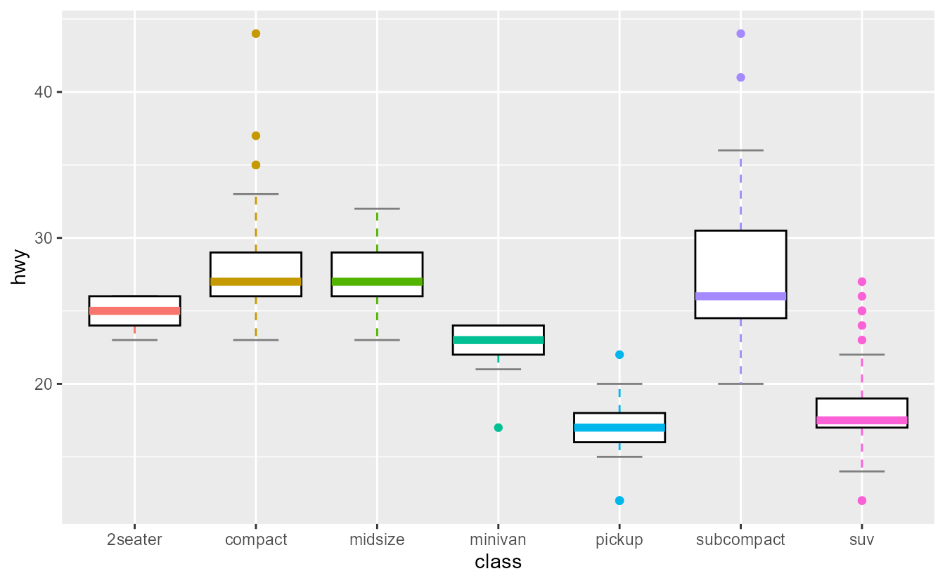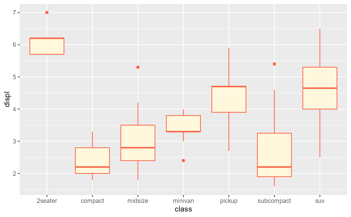 ggplot(mpg, aes(class, displ)) +
