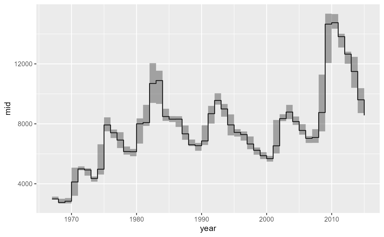 ggplot(head(eco, 10), aes(year, y = mid)) +