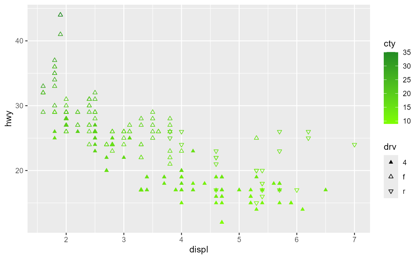 ggplot(mpg, aes(displ, hwy, shape = drv, colour = cty)) +