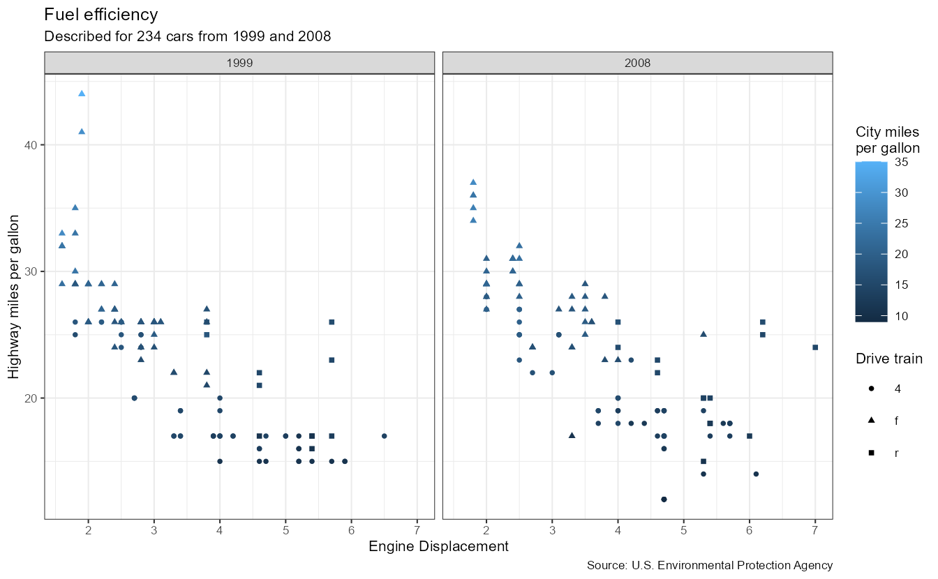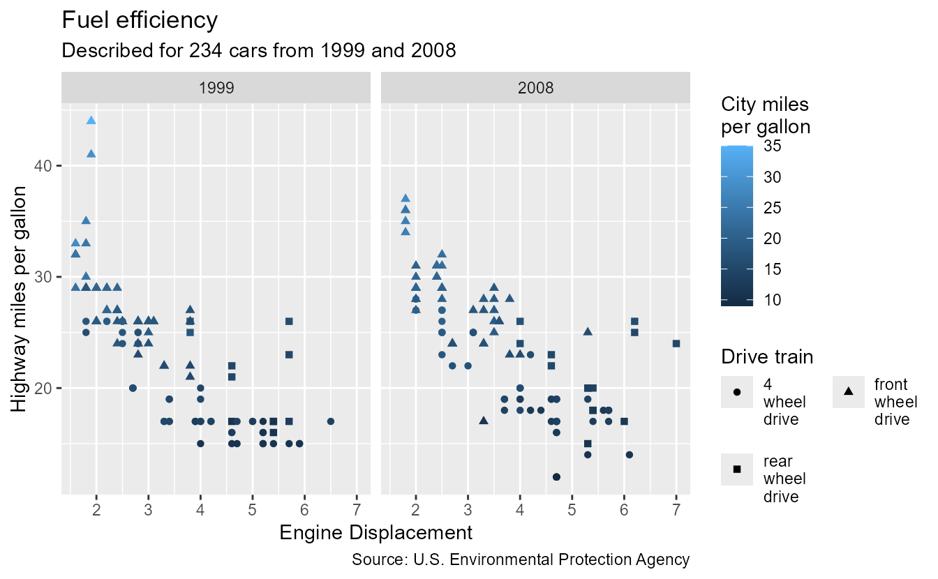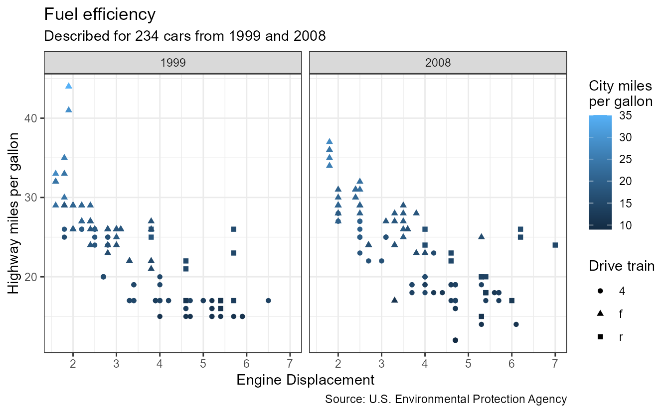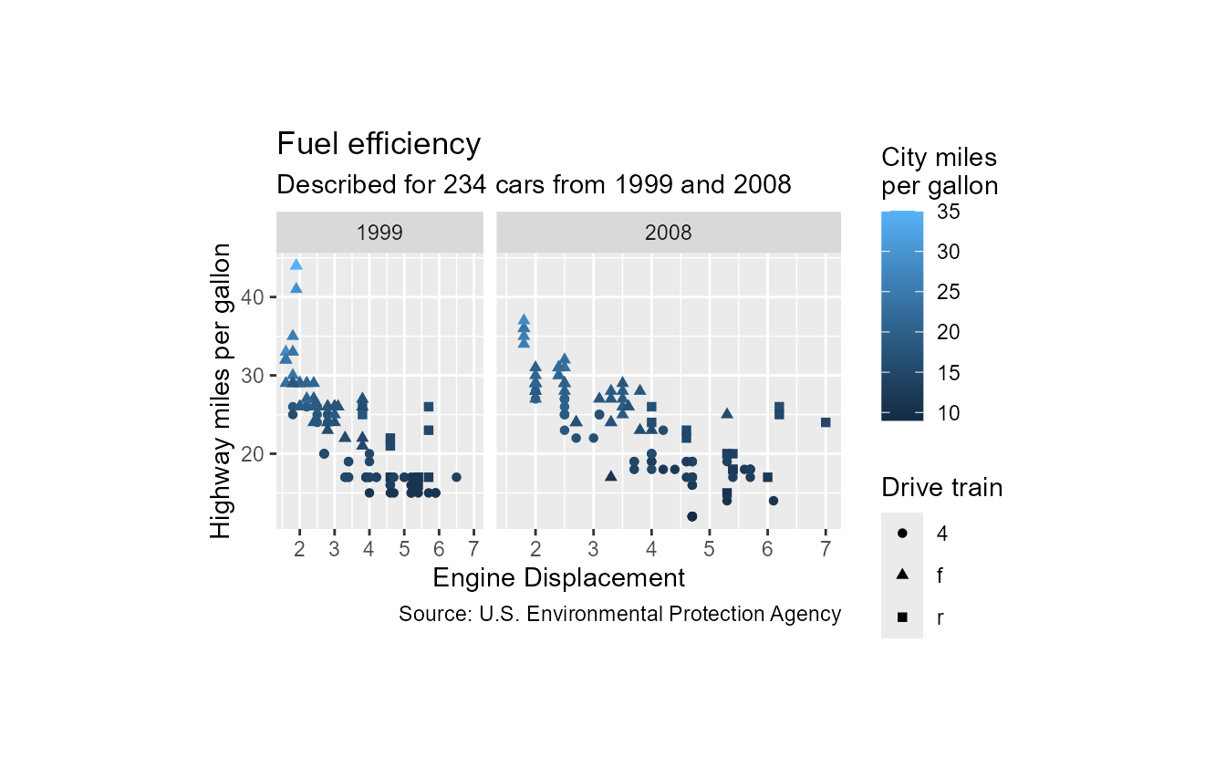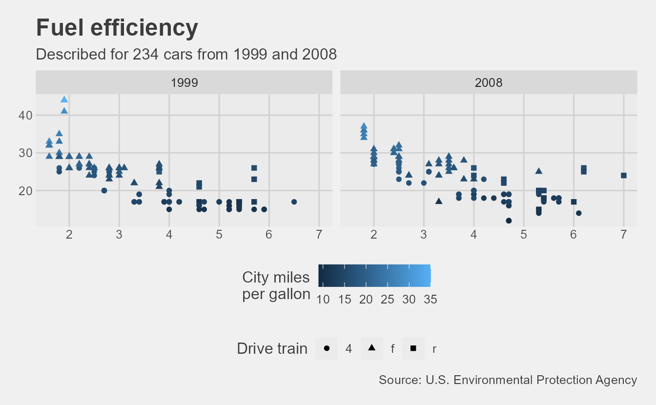 subtitle = paste0("Described for ", nrow(mpg), " cars from 1999 and 2008"),