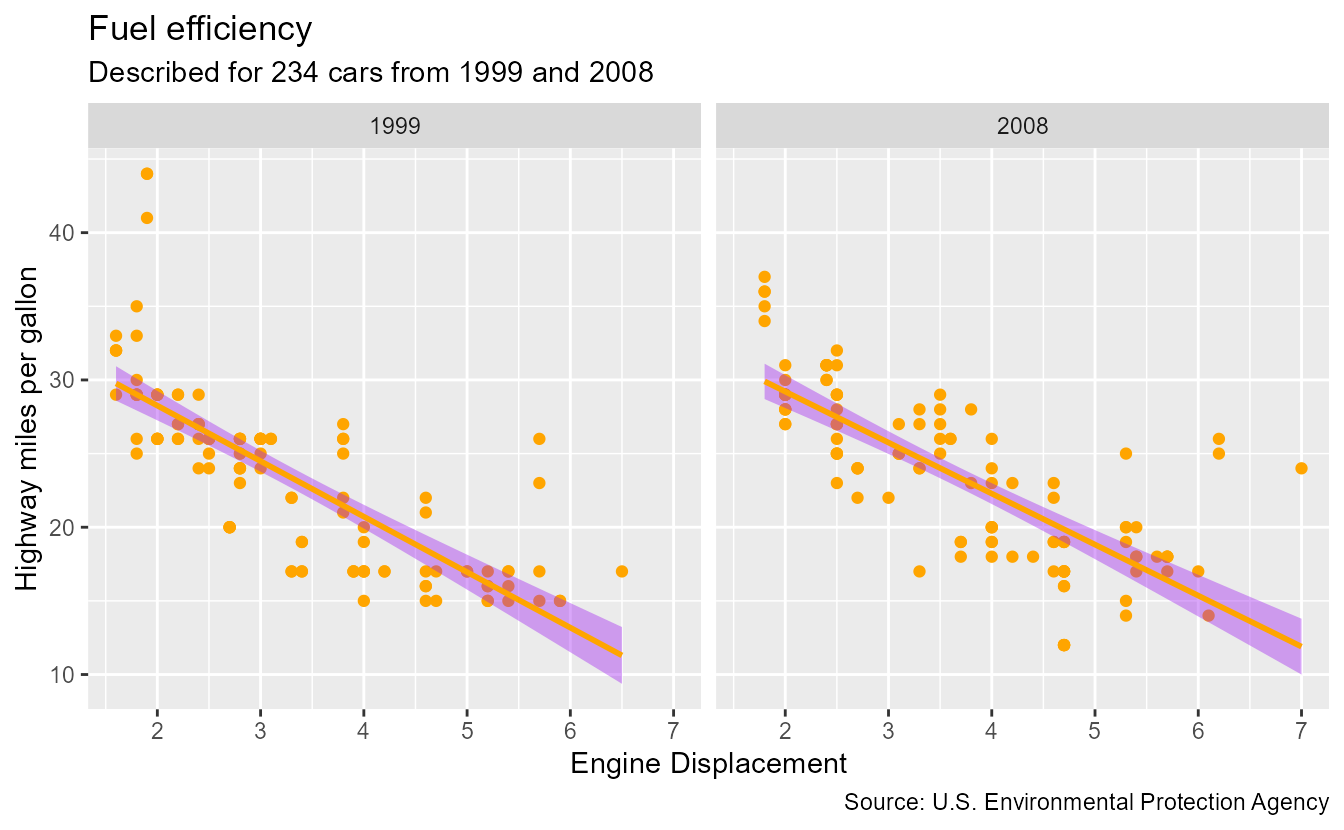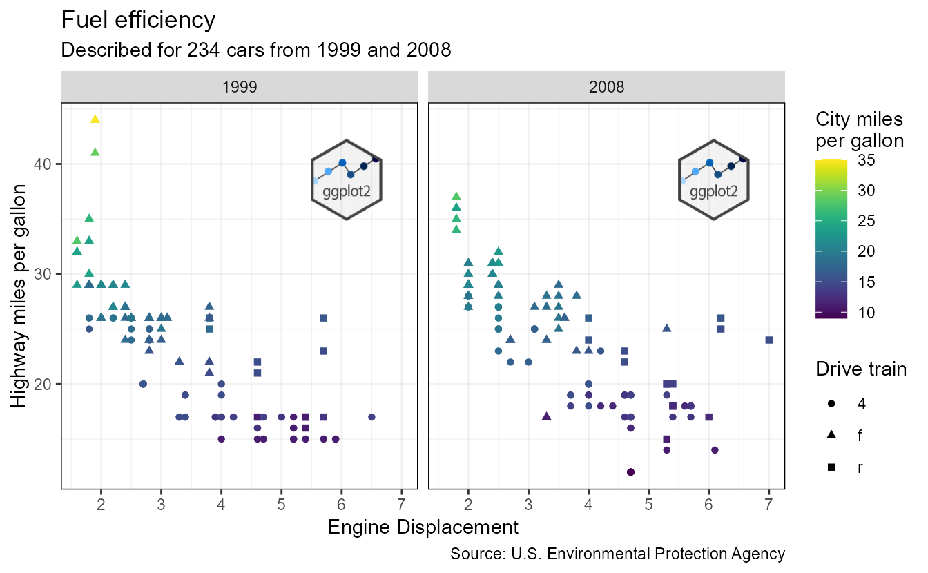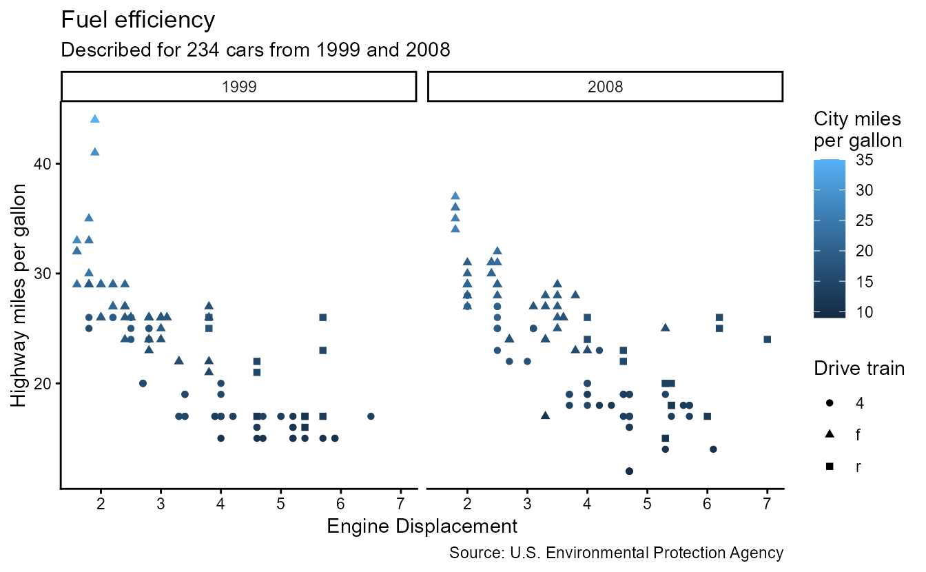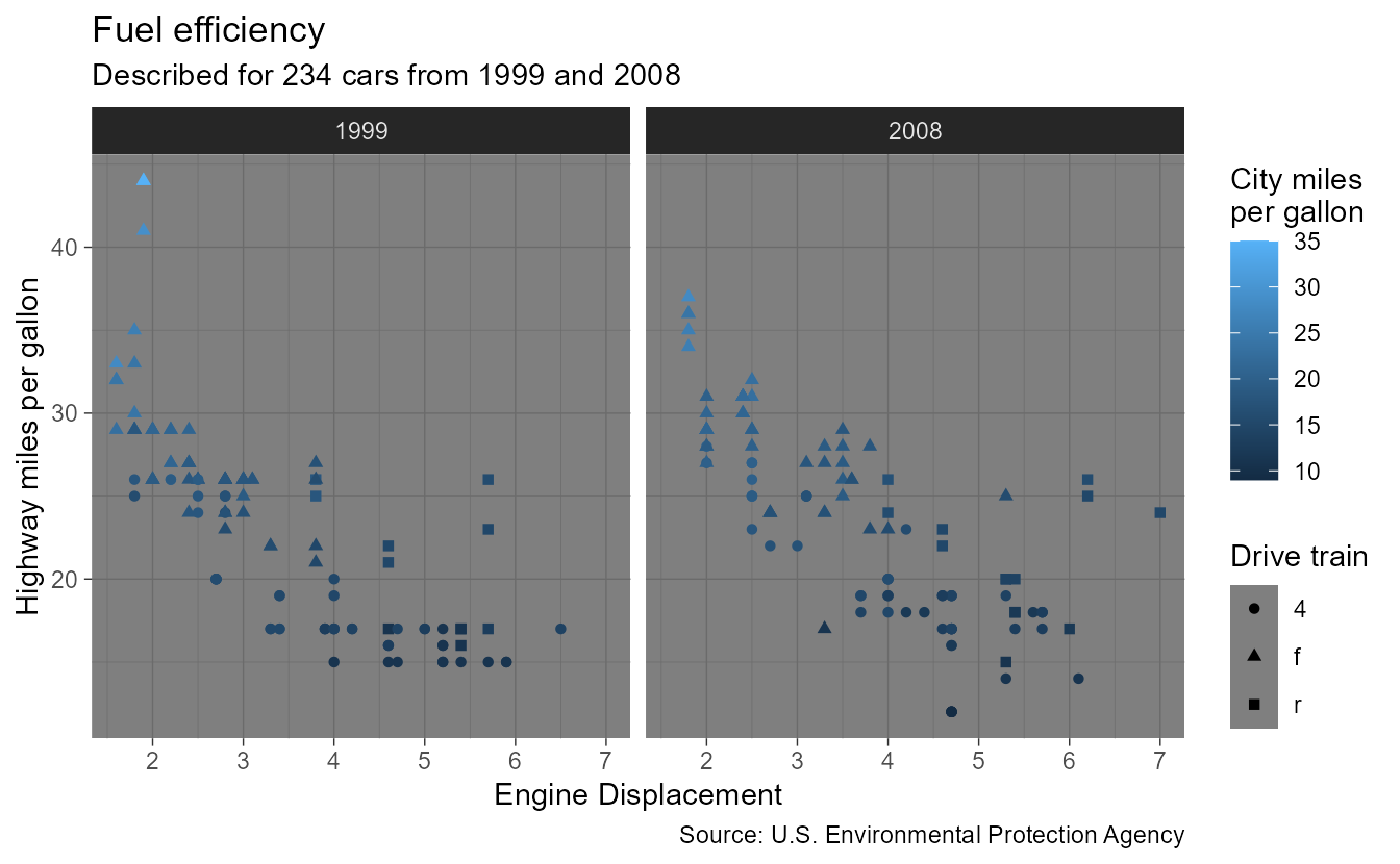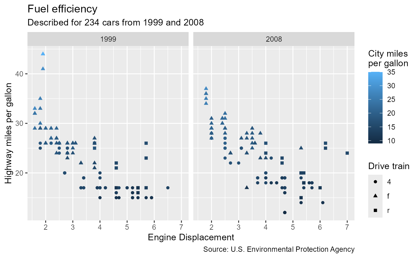 subtitle = paste0("Described for ", nrow(mpg), " cars from 1999 and 2008"),