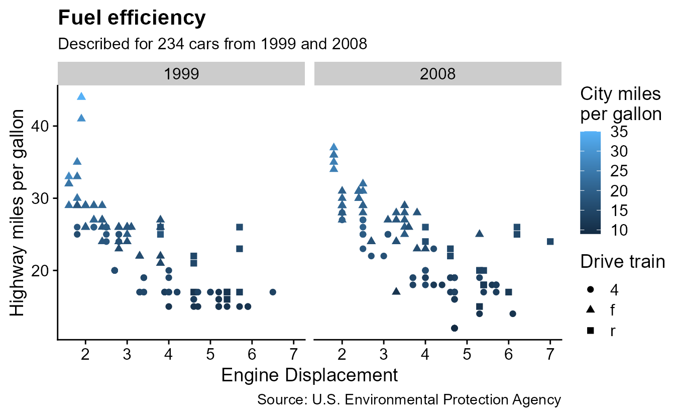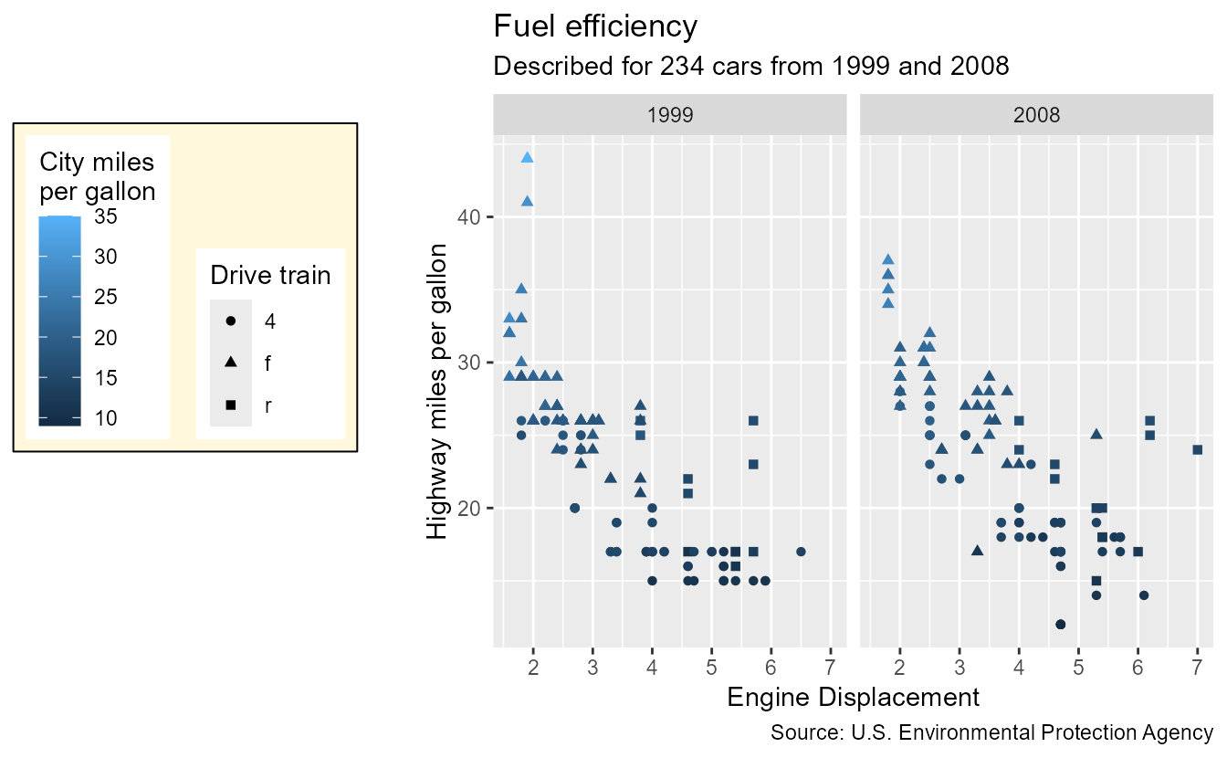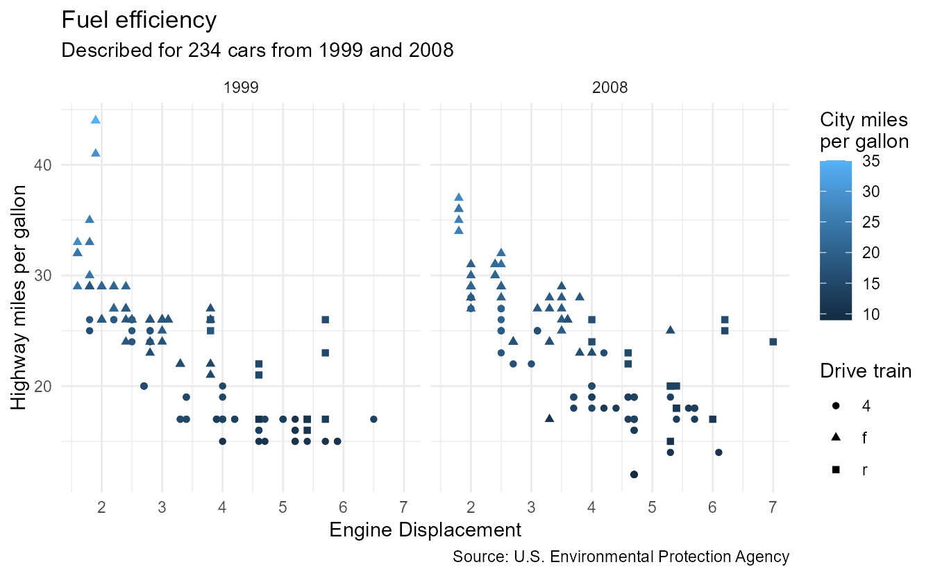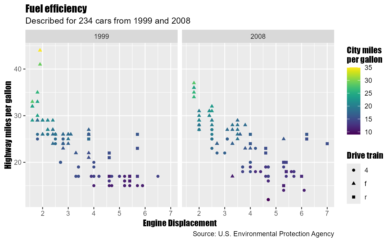 subtitle = paste0("Described for ", nrow(mpg), " cars from 1999 and 2008"),