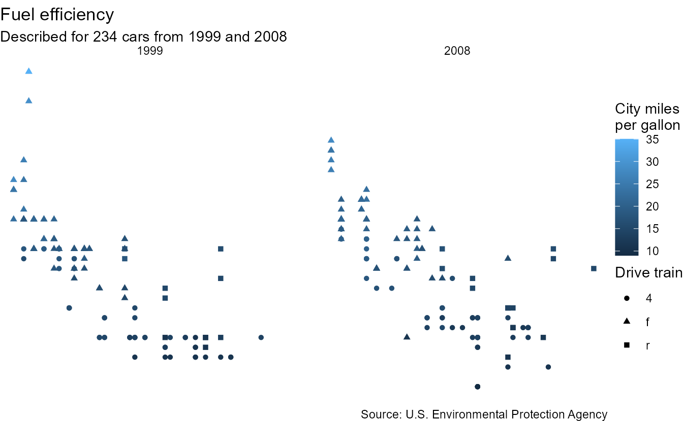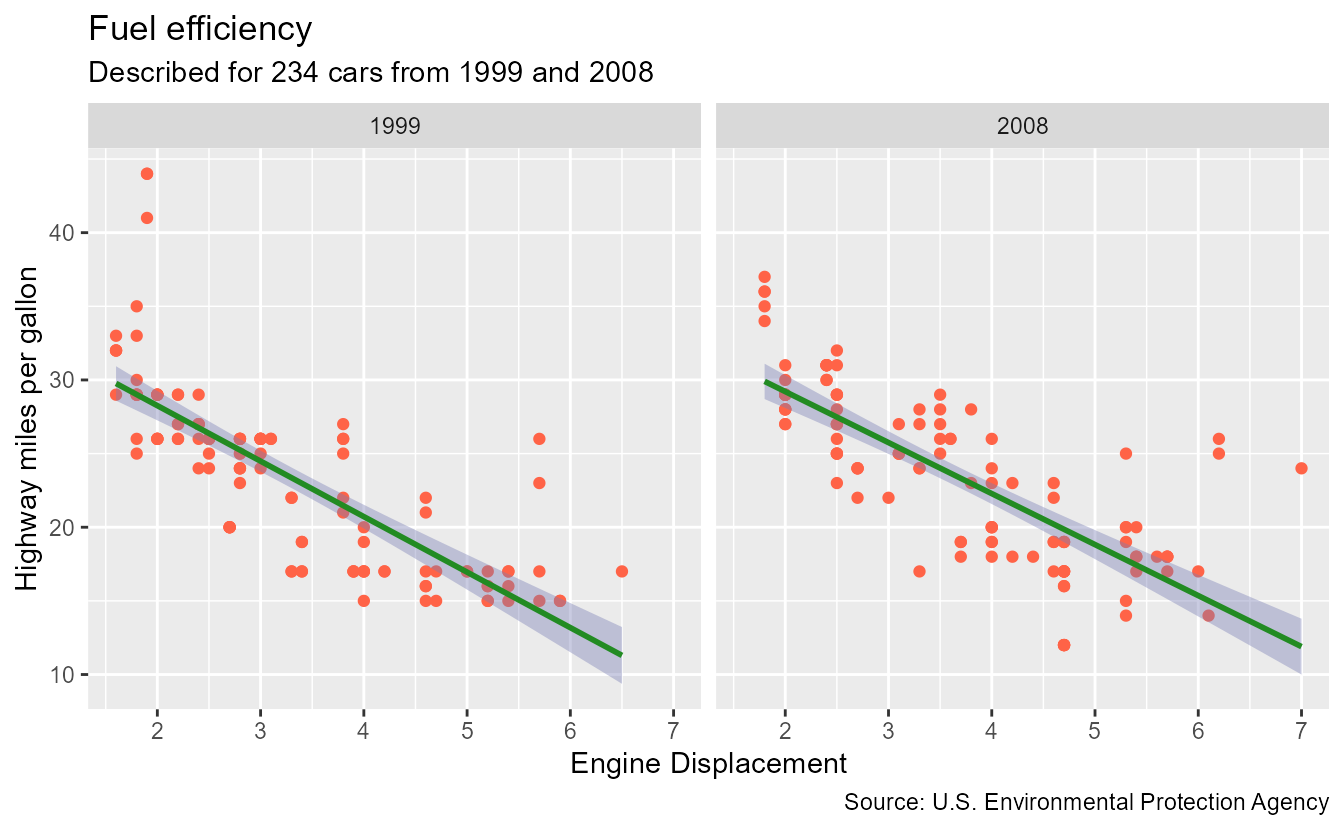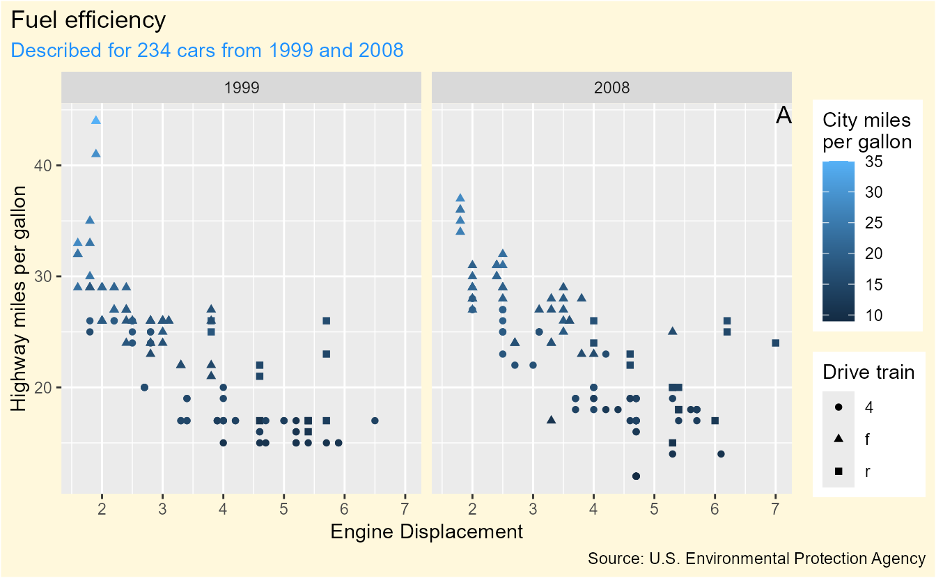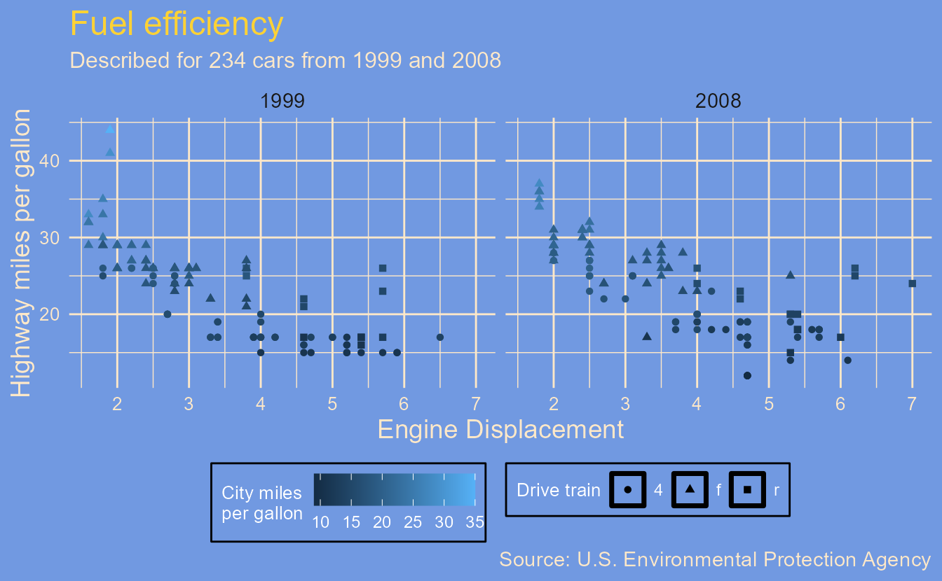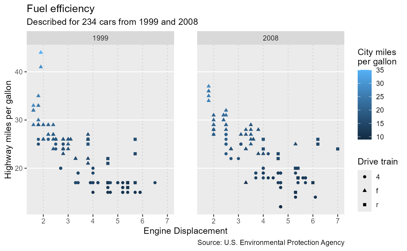 subtitle = paste0("Described for ", nrow(mpg), " cars from 1999 and 2008"),